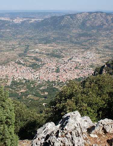 Noch einmal weist ein Schild auf die Wege hin und auch die orangen Markierungen sind nicht zu übersehen. Sie leiten teils recht steil den Berg hinauf, bis man auf der Punta di Frassu (336 m) eine Turmruine erreicht (wunderschöne Aussicht). Kurz hinter dieser Stelle wendet man sich nach Süden und erreicht nach knapp zwei Stunden einen Fahrweg (333 m), dem man nach links folgt. In der nächsten Kurve zweigt ein Pfad ab, der uns durch den Wald zur Bocca di Catrusia (333 m) und zur D 302 führt. Hier enden vorerst die Markierungen.