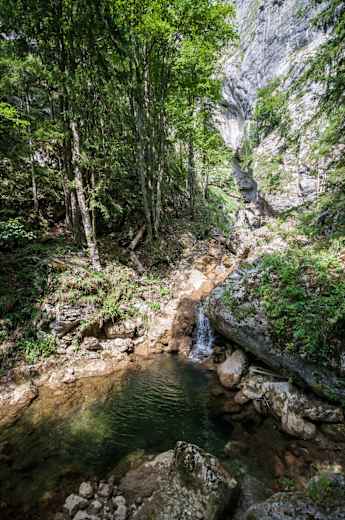 Bärenschützklamm Foto: Kurt Schall Aussichtspunkt am Anfang der Tour. Ein letzter Blic k zurück ins offene Tal, danach gehts in die Klamm. Foto: Kurt Schall Eine kleine Höhle beim Abstieg, kurz nach der große n Felswand und dem Klettergarten. Foto: Kurt Schall Einer der beiden Badeplätze direkt am Weg. Foto: Kurt Schall Bärenschützklamm Foto: Kurt Schall Bildergalerie (5)