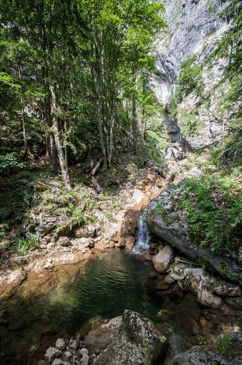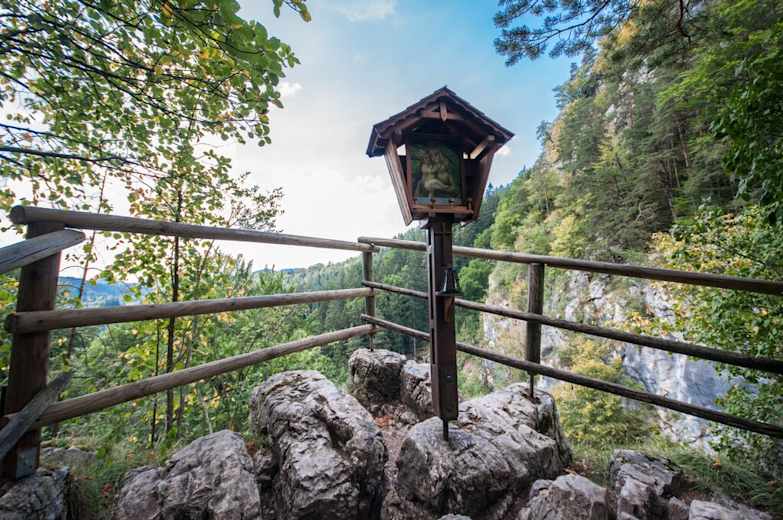 Völlig unerwartet steht man plötzlich vor der beeindruckenden Klamm mit ihren freien Wasserfällen und schroffen Felsen. Die Leitern führen steil nach oben und das Wasser rauscht unter den Füßen vorbei. Auch wenn es verlockend ist, in die zahlreichen Gumpen einzutauchen, so ist es wohl ratsamer am Weg zu bleiben. Die schroffen Felsen werden bald von einem Urwaldartigen Dickicht abgelöst und das satte grün ist hier selbst im Hochsommer zu bestaunen. Man mag sich gut vorstellen, wie hier nach einem starken Regenfall die Post abgeht. Langsam schraubt man sich nach oben, bis man beim Ausstieg angelangt ist und in weiteren 15 Minuten über einen breiten Hohlweg zum Guten Hirten gelangt. Eine Einkehr lohnt sich, nicht nur wegen des kulinarischen Bedürfnisses, sondern auch um die Eindrücke der tosenden Klamm zu verdauen.