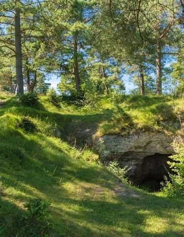 Wir gehen rechts abwärts weiter am Trauf entlang. Nach 20 Minuten, etwa 200 m vor unserem Parkplatz, führt ein schmaler Pfad zum Goldloch hinab, eine 33 m lange Höhle, deren Namen auf einen Fund von mehreren Hundert Münzen im Jahr 1778 zurückgeht. Von da wird in wenigen Minuten wieder der Parkplatz erreicht.