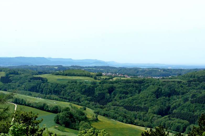 Wir steigen wieder über die Treppen zurück auf den Forstweg und wandern weiter zur Waldschenke. Sie gehört zum Rosenstein. Für die Kinder gibt es hier einen Spielplatz. Wer möchte, kann zur Pliksburggrotte oder zur Dreieingangshöhle marschieren. Die Kinder und ich wandern weiter, es geht zum Lärmfelsen. Es ist der bekannteste Aussichtspunkt am Rosenstein und entsprechend viele Wanderer kommen hierher. Bei optimalem Wetter sind der Schwarzwald und der markante Stuttgarter Fernsehturm gut zu erkennen.