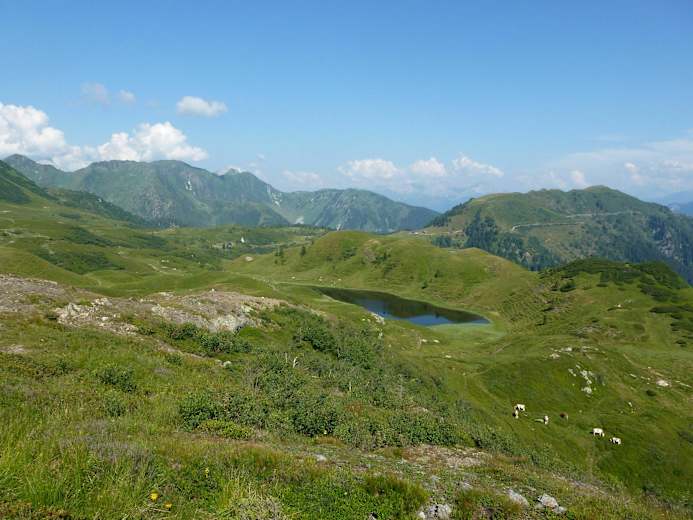 6. Etappe Karnischer Höhenweg: Von der Zollnersee Hütte (1.738 m) zum Naßfeldpass (1.530 m) bzw. Alpenhotel Plattner (1.609 m). Diese Etappe weist keine besonders großen Höhenunterschiede auf und auch keine nennenswerten alpinistischen Schwierigkeiten. Dennoch ist sie wegen der zurückzulegenden Distanz nicht zu unterschätzen. Überwiegend durchwandert der Weg weitläufige Almlandschaften, wie gleich zu Beginn beim Zollnersee, der mit dem Hohen Trieb im Hintergrund ein besonders schönes Fotomotiv abgibt. Lohnende Wanderung am Karnischen Hauptkamm.