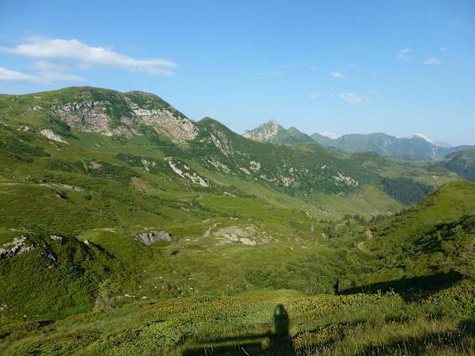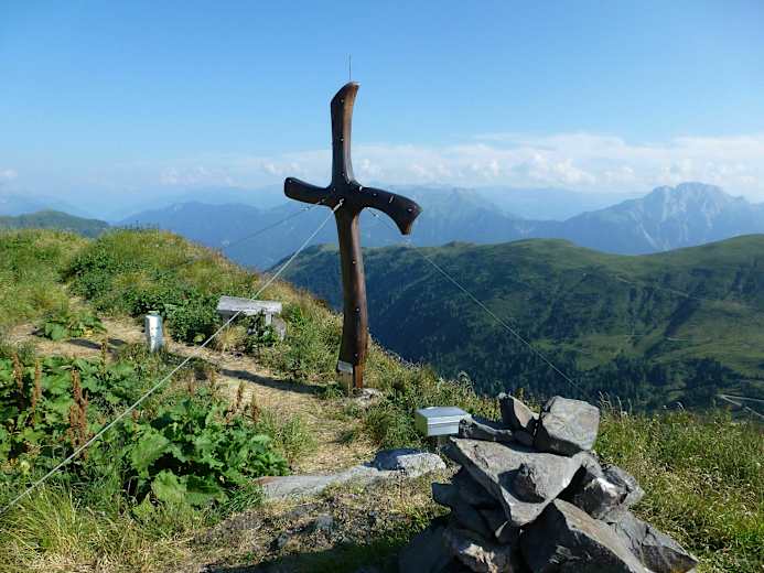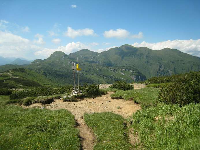 Nun geht es auf der Almstraße ansteigend kurz nach Süden bis zu einer Kreuzung am Rand einer großen Moorwiese. Hier zweigt man nach Osten ab und folgt der Straße durch den Wald bis zur Abzweigung zur Kleinkordinalm. Die Alm links unten liegen lassend führt ein Karrenweg zum Kordinsattel (1.749 m), wo der Steig der Grenze über einen flachen Rücken aufwärts folgt. Bald zweigt auf einer flachen Wiese der Steig Nr. 419 nach links zum Hochwipfel ab.