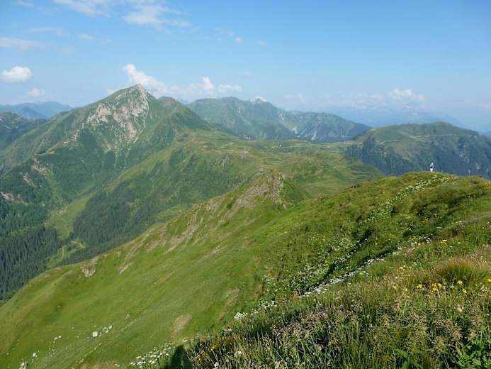 Beim folgenden Aufstieg Richtung Madritschen (1.919 m) erreicht man die Pisten des Schigebietes Nassfeld. Empfohlen sei hier die Variante südlich der Madritschen, die nun quer durch eine künstlich geschaffene Wassererlebniswelt verläuft, ehe man östlich der Madritschen an den Pistenrändern entlang zum Naßfeldpass (1.530 m) absteigt. Ein kurzer Aufstieg über eine Asphaltstraße bringt einen dann zu Plattner’s Alpenhotel (1.609 m).