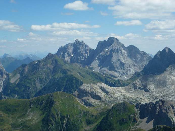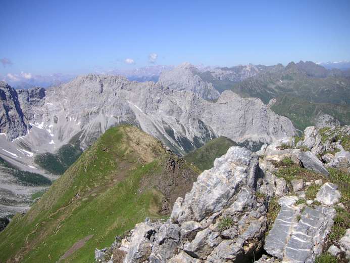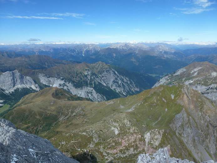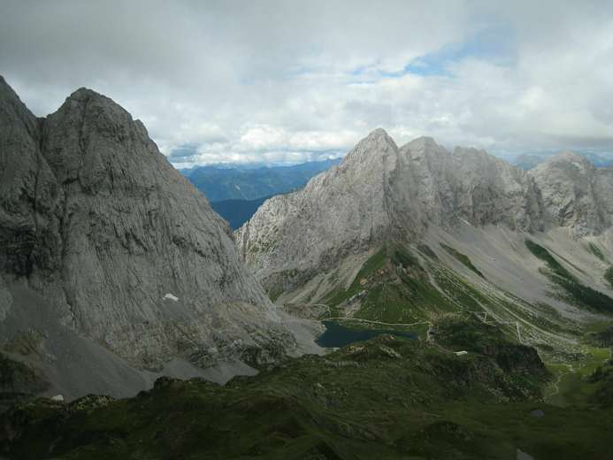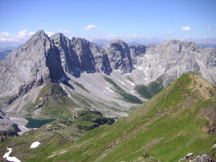 Am Gipfel empfängt einen das 2007 errichtete „Europakreuz“ und fast schlagartig tut sich ein großartiger Rundblick mit atemberaubenden Tiefblicken auf. Besonders eindrucksvoll hat man im Süden die Hohe Warte mit ihrer Nordwand direkt gegenüber. Beim Abstieg folgt man vorerst dem Aufstiegsweg über die Grashänge hinunter bis zur Wegkreuzung beim kleinen Sattel. Nun wendet sich der Weg Nr. 438 kurz nach Westen und führt dann entlang eines kupierten Rückens über teils felsdurchsetzte Wiesen Richtung Südwesten hinunter ohne besondere Schwierigkeiten direkt zur Wolayersee Hütte.