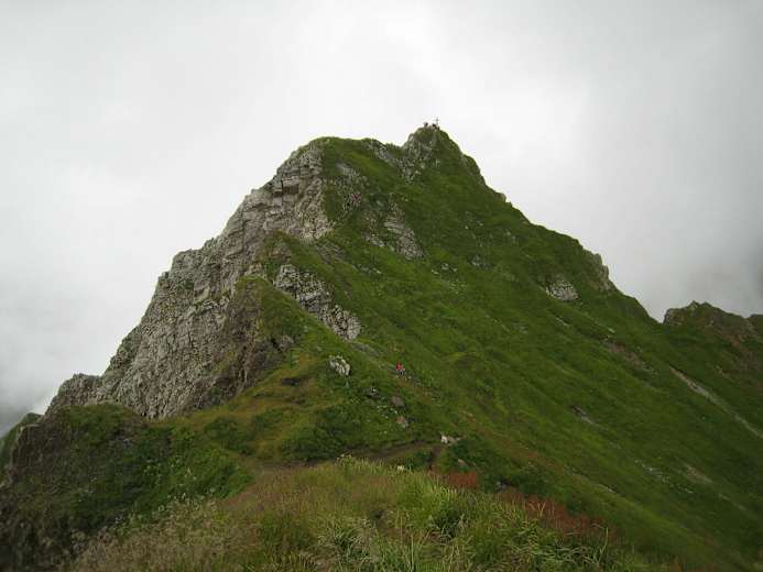 In langen und kurzen Serpentinen schlängelt sich der Steig nun durch die steilen Grashänge hinauf zu den Einsattelungen zwischen West- und Ostgipfel. Wer sich hier dem weiteren Aufstieg auf den höheren Ostgipfel nicht gewachsen fühlt, kann sich nun links über einen kurzen Grasrücken mit dem Westgipfel (2.436m) begnügen – auch hier bietet sich ein schöner Rundblick. Das letzte Stück zum Ostgipfel (2.460m) führt der Steig durch sehr steile felsdurchsetzte Grashänge, zuletzt sind Drahtseilsicherungen vorhanden.