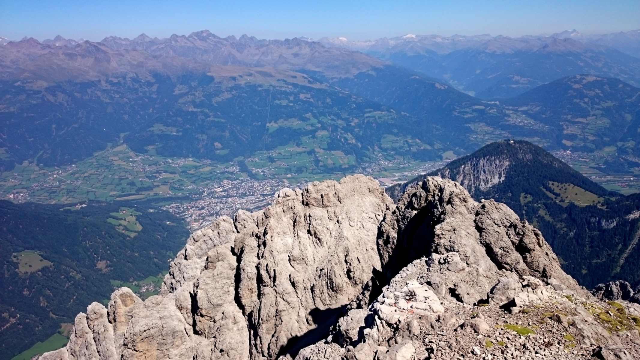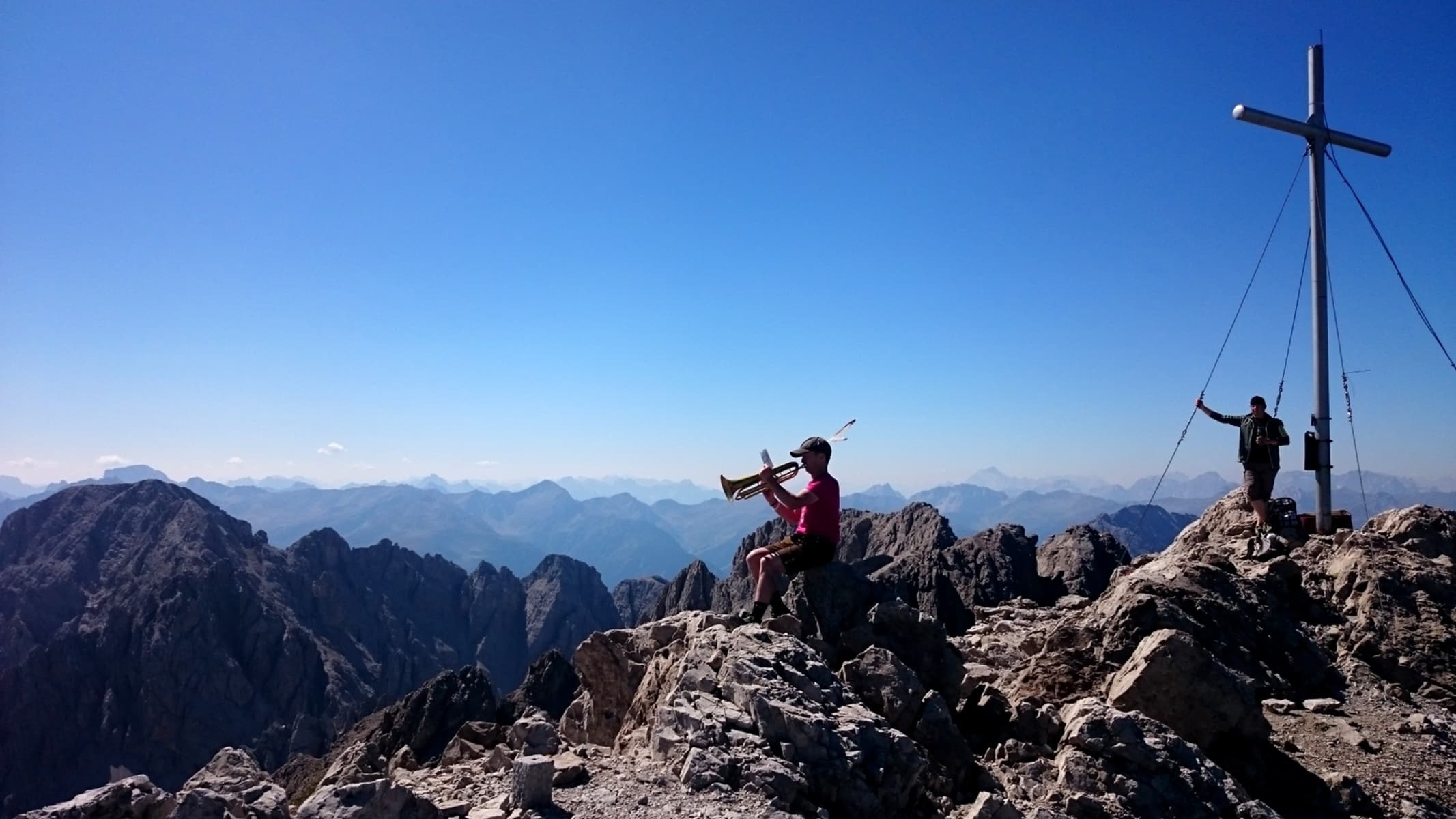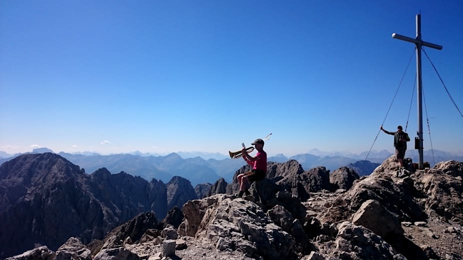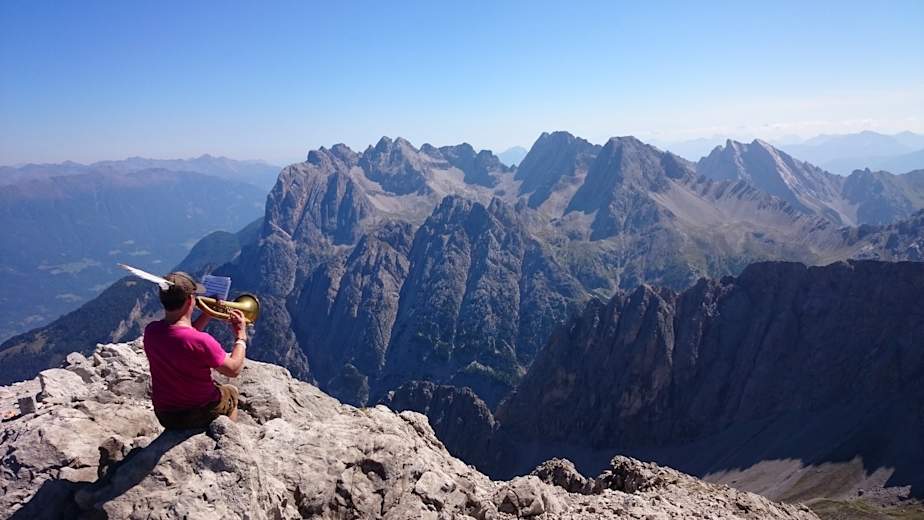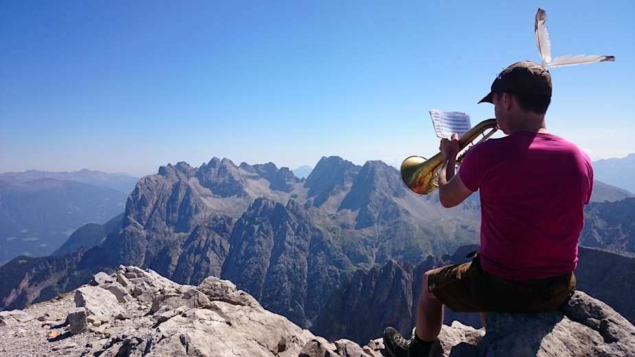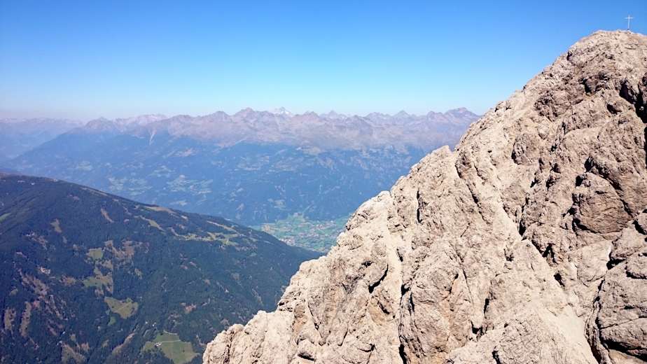 Oben in der Übergabezone zwischen Bergläufer und Paragleiter genießt man tolle Ausblicke nach Westen ins Kühbodental und vielleicht auch eine kleine Stärkung für die finale Etappe. Man folgt nun quasi der Strecke der Paragleiter, indem man nach kurzem Abstieg die ausgedehnten Schotterhalden des Spitzkofels quert, um zum behelfsmäßig markierten Paragleiterstartplatz zu gelangen. Kurz danach, ab ca. 2.500 m, beginnt die leichte Kletterei zum Gipfel. Ausgesetzte Stellen sind zwar durchwegs mit Stahlseilen gesichert, jedoch sind Trittsicherheit und Schwindelfreiheit unabdingbar. Zur Halbzeit der Kletterei passiert man die wunderbar gelegene Linderhütte (2.684 m), um anschließend durch eine schattige Nische kurz abzusteigen, bevor der finale Gipfelanstieg erfolgt. Trotz seiner moderaten Höhe (2.718 m) fühlt man sich am Spitzkofel sehr hoch oben und der Ausblick lässt keine Wünsche offen. Wer enormes Glück hat, trifft vielleicht sogar zufällig einen Trompetenspieler am Gipfel.