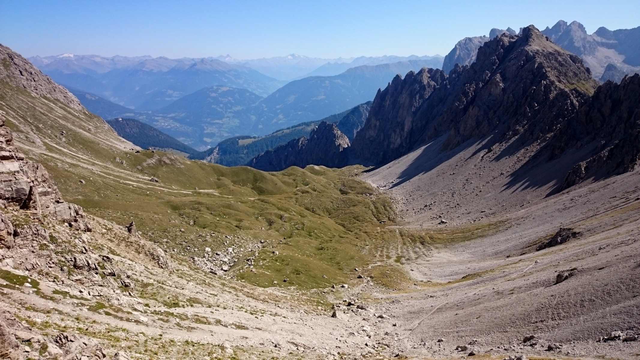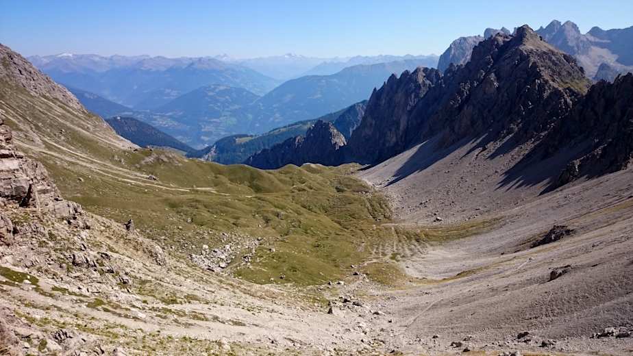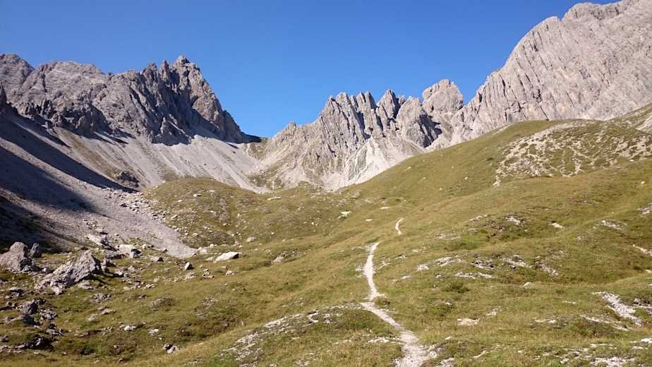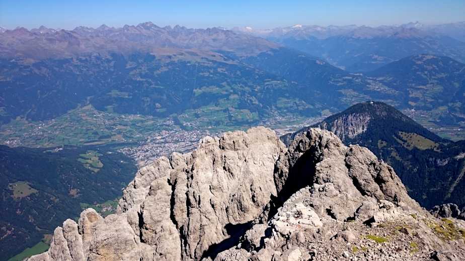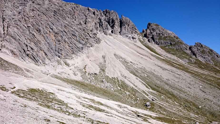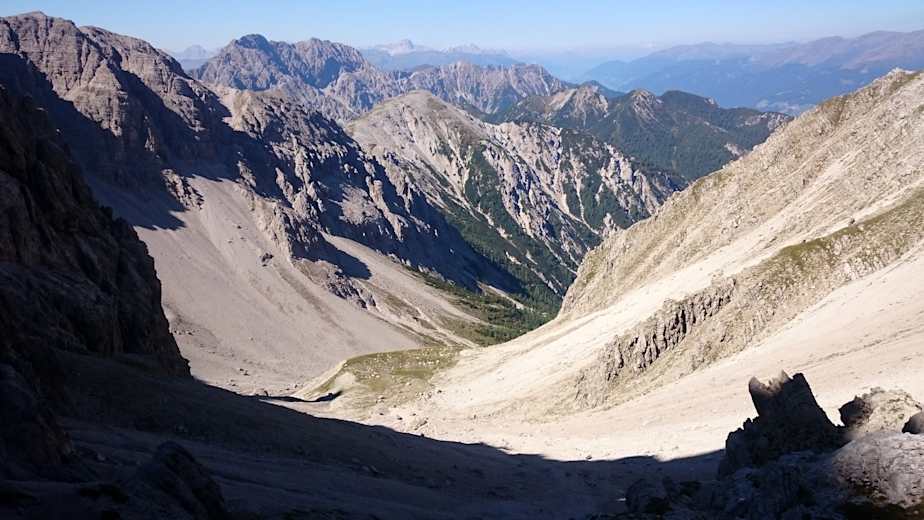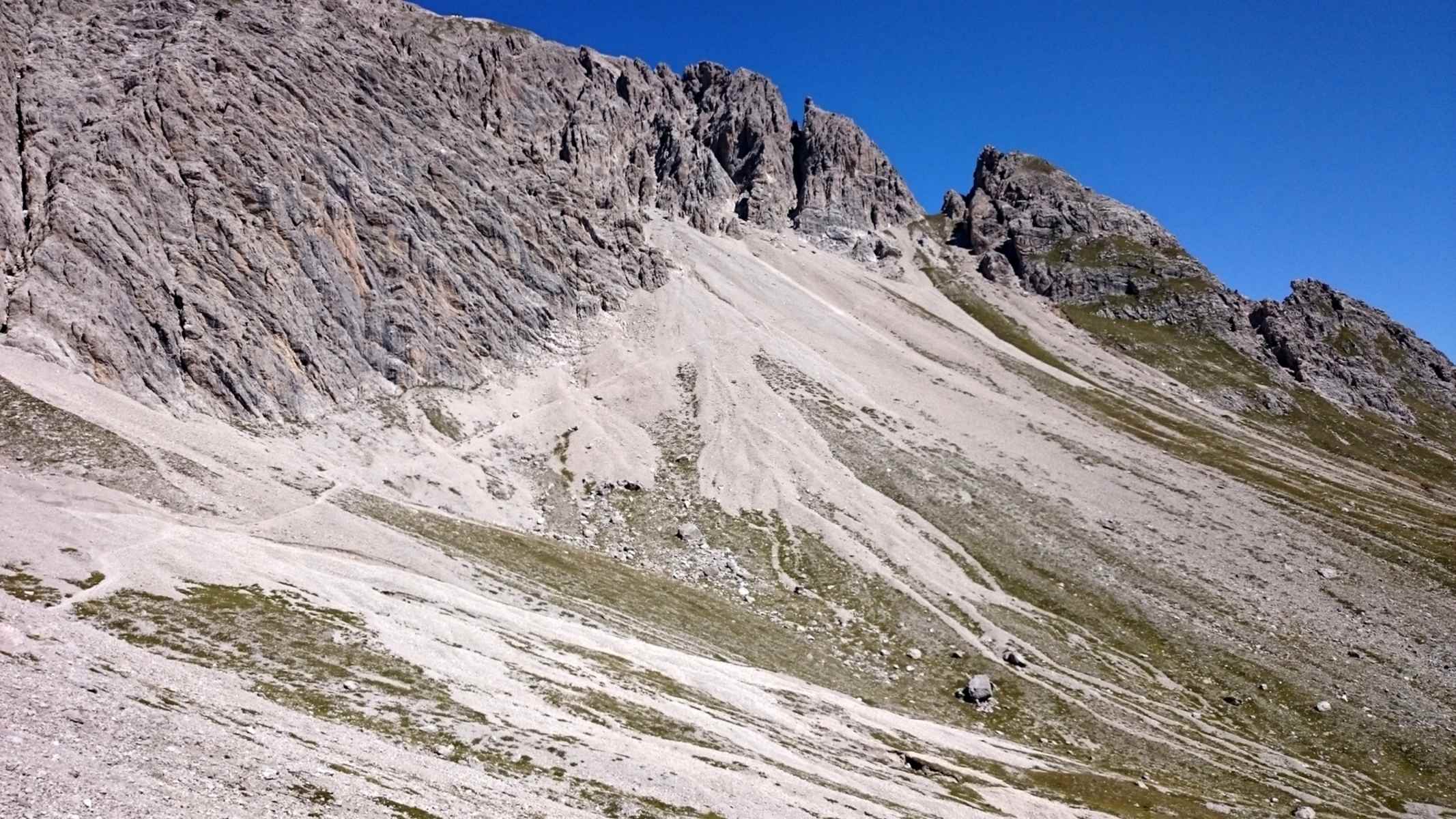 Oben in der Übergabezone zwischen Bergläufer und Paragleiter genießt man tolle Ausblicke nach Westen ins Kühbodental und vielleicht auch eine kleine Stärkung für die finale Etappe. Man folgt nun quasi der Strecke der Paragleiter, indem man nach kurzem Abstieg die ausgedehnten Schotterhalden des Spitzkofels quert, um zum behelfsmäßig markierten Paragleiterstartplatz zu gelangen. Kurz danach, ab ca. 2.500 m, beginnt die leichte Kletterei zum Gipfel. Ausgesetzte Stellen sind zwar durchwegs mit Stahlseilen gesichert, jedoch sind Trittsicherheit und Schwindelfreiheit unabdingbar. Zur Halbzeit der Kletterei passiert man die wunderbar gelegene Linderhütte (2.684 m), um anschließend durch eine schattige Nische kurz abzusteigen, bevor der finale Gipfelanstieg erfolgt. Trotz seiner moderaten Höhe (2.718 m) fühlt man sich am Spitzkofel sehr hoch oben und der Ausblick lässt keine Wünsche offen. Wer enormes Glück hat, trifft vielleicht sogar zufällig einen Trompetenspieler am Gipfel.