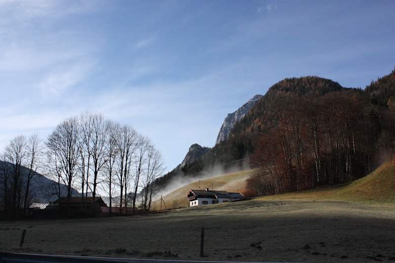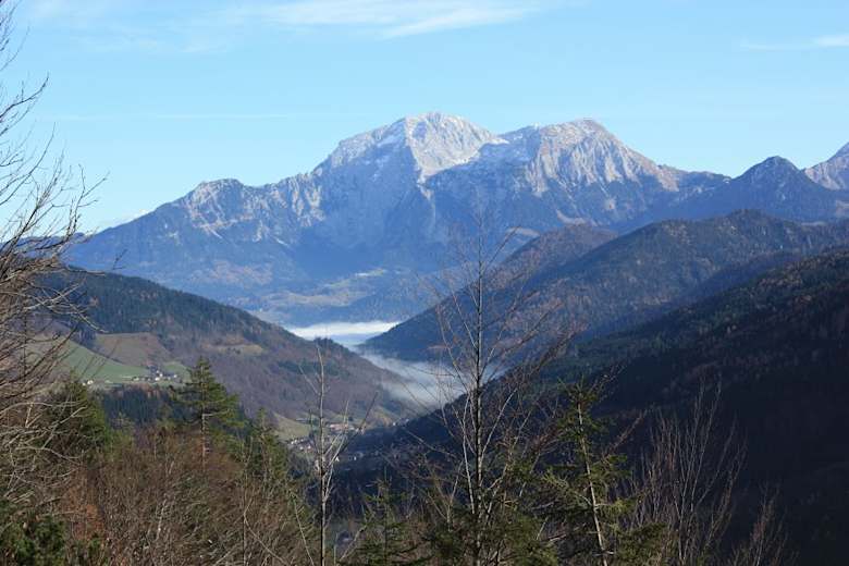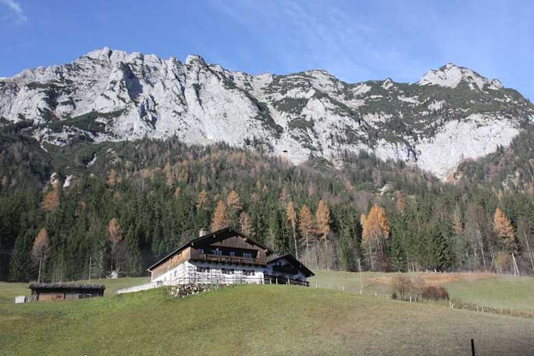 Nach einer Rast auf der im Sommer einfach bewirtschafteten Alm geht es den gut befestigten Güterweg (Nr. 472) links Richtung Halsgrube hinunter. In steilen Serpentinen zieht sich der breite Weg bis zum Abzweig Böslsteig, man wandert hier weiter links bis zur Hirschbichlstraße hinunter. Hier kann man sich links zurück zum Parkplatz wenden oder noch ein kurzes Stück geradeaus in den Wald bis zum idyllischen Klausbach wandern.