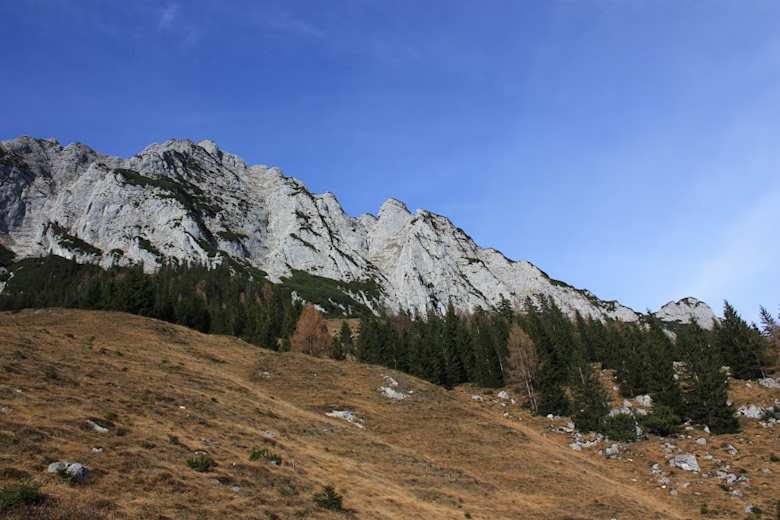 Etwa 200 m weiter führt rechts ein steiler, mit Steinen und kleinen Felsen durchsetzter Steig ab. Man wandert an einem Marterl vorbei, trifft auf einen teils sehr steilen, schotterigen und rutschigen Karrenweg, dem man folgt. Vor einer sehr steilen Rechtskurve (Sackgasse) führt links ein leicht zu übersehender, unmarkierter Pfad weiter bergauf. Schließlich trifft man auf den breiteren Fußweg, der von Triebenbach zur Halsalm führt. Man geht links weiter, der Weg führt aussichtsreich und nun leichter über den Tonecker- und den Hinterseegraben über ein paar Holzstufen und durch ein Gatter zur Almfläche der Halsalm (1.213 m).