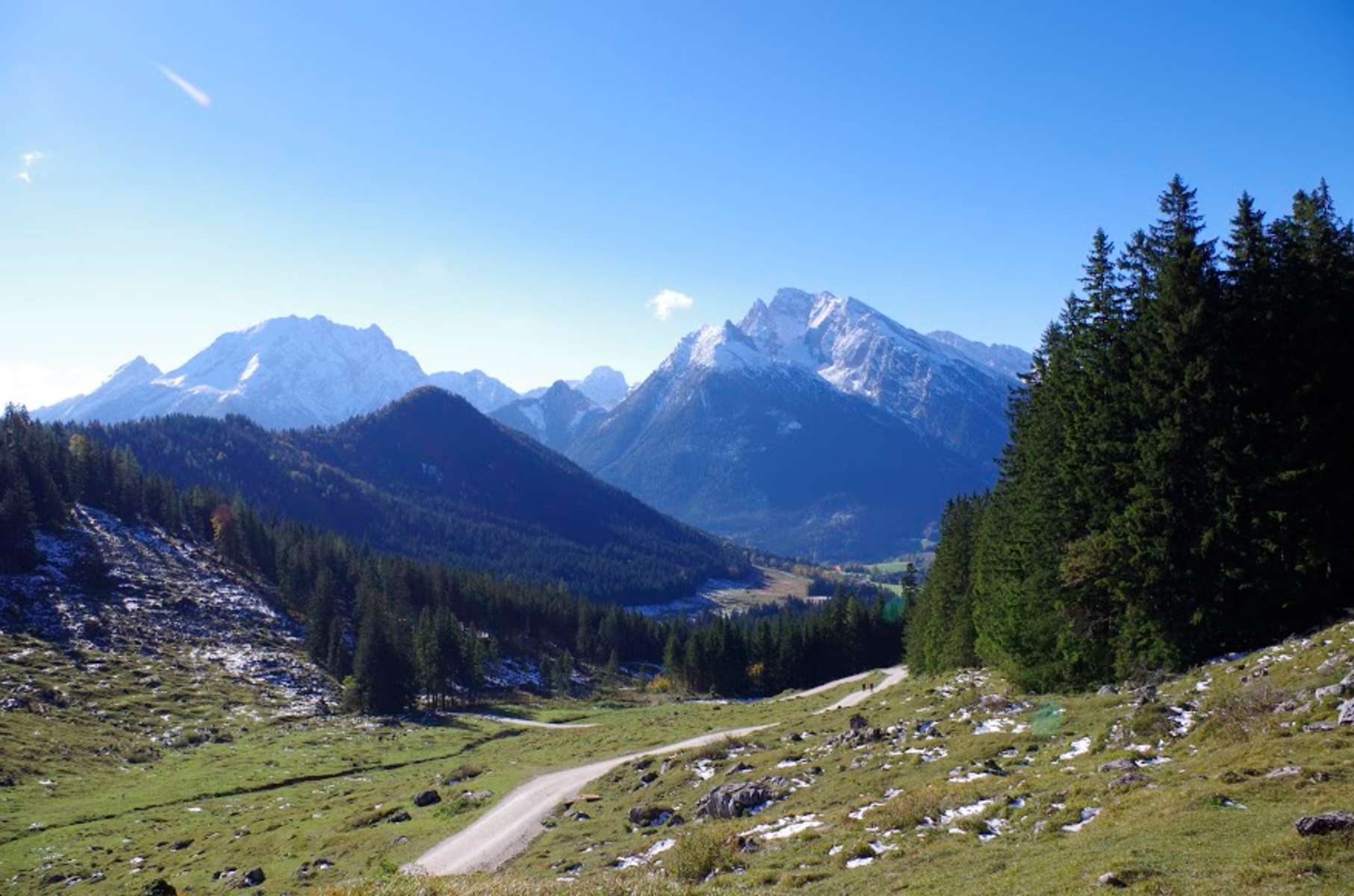 Ohne nennenswerte Steigung führt der Weg weiter um den Schmuckenstein herum, an der nächsten Kreuzung geradeaus halten. Der Pfad wird allmählich zu einem breiteren Karrenweg, der leicht bergab auf das Gelände der Mordaualm (1.191 m) führt. Links hinter der Alm führt der Weg weiter zu einem Holzkreuz und mehreren Sitzbänken, von denen aus man eine wunderbare Aussicht auf den Hochkalter genießen kann. Von hier folgt man dem gut ausgetretenen, später wurzeligen Pfad links. Dieser führt nun wieder in den Wald hinein, an einer mit einem Pfosten markierten Abzweigung unbedingt rechts halten. An einer weiteren Kreuzung geht man geradeaus, beim nächsten Wegweiser wandert man links und erreicht eine Gabelung, an der man sich an einem ziemlich ausgewaschenen Forstweg rechts hält. Immer auf diesem bergab führenden Hauptweg hinab und man gelangt wieder auf das bekannte Gelände der Skipiste.