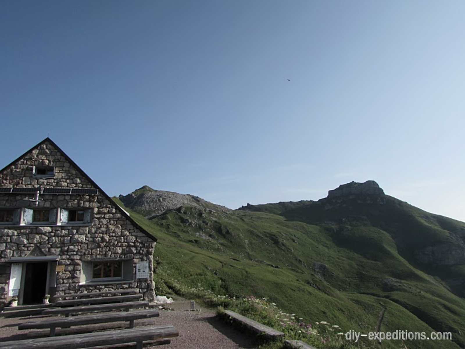 Die Pause muss kurz ausfallen – der Weg ist noch weit, aber weiterhin spektakulär. Der Abstieg vom Augstenberg ist einfach und führt geradewegs zur Pfälzer Hütte (2.108 m) an der Österreichisch-Liechtensteiner Grenze. Die Hütte ist ein guter Stützpunkt für jene, die den Tag in teilen wollen: Küche und Unterkünfte stehen bereit. Auch ist ein Abstieg zum Nenzinger Himmel als Variante und Ende der Tour denkbar.