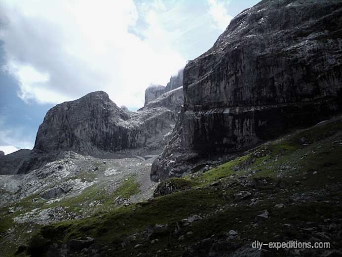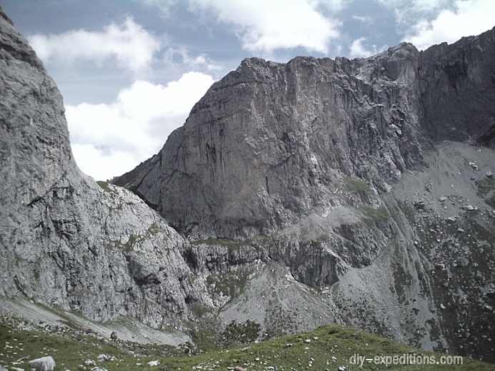 Nach einem feinen Bergfrühstück auf der Schesaplana Hütte (1.908 m) folgt man dem Rätikon-Höhenweg Süd nach Osten, unter den Wänden der Schesaplana. Eine beeindruckende, abweisende Landschaft. Der Weg selbst ist recht flach mit sanften Anstiegen. Mögliche Lücken nach Norden wie die Gamslücken oder das Gafalljoch lässt man vorbei ziehen, auch wenn sie Blicke auf den Lünersee eröffnen würden. Geduldig marschiert man bis zum Schweizer Tor (2.137 m), ein massiver Einschnitt in den grauen Fels. Hier nimmt man wenige Schritte auf einer fixierten Metallleiter hoch, und schon ist man wieder auf der Vorarlberger Seite des Rätikon.