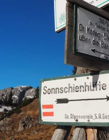 Nun nicht den selben Weg zurück, sondern den Grat/Rücken entlang bergab bis zum Gott-Sei-Dank-Bankerl mit Dachsteinblick. Hier biegt der Wanderweg, Grazersteig genannt, von der Hochmölbinghütte kommend scharf nach links ab und ins Tal. Der Beschilderung nach Schönmoos folgen bis man an einem Abbruch mit Stacheldrahtzaun vorbeigeht. Hier verlässt man den markierten Wanderweg und geht die Forststraße entlang. In zwei Kurven abwärts und beim Schranken links halten.