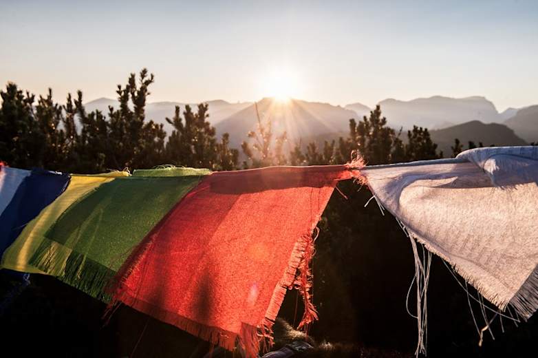 Tibetische Gebetsfahnen am Gipfel des Raidling. Foto: Rene Sendlhofer