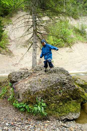 Unter der Brücke rauscht der Fluss, je nach Wasserstand. Besonders wenn der Schnee im Bayerischen Wald schmilzt, verwandelt sich die sonst so friedliche Ohe in einen reißenden und wilden Fluss. Bei dem kommenden Abschnitt bis ins Dorf Ringelai ist es besser, wenn Eltern mehr Zeit einplanen. Überall am Weg liegen die für den Bayerischen Wald so typischen Findlinge auf Granit.