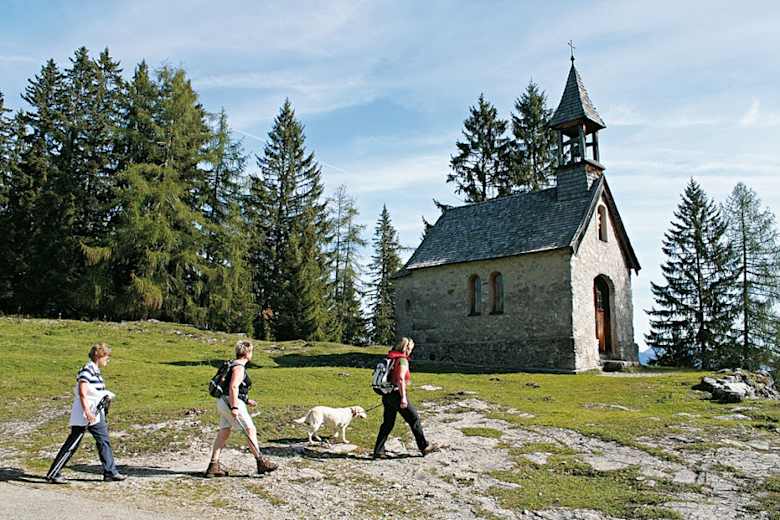 Hinter dem Gasthof Hindenburghütte (1.206 m) startet unser Weg links bergauf auf einer geteerten Straße durch blühende Wiesen hindurch. Hier auf der Alm werden Kühe und Pferde gehalten. Vorsicht, Elektrozaun! Hunde sollten deshalb angehängt werden, worauf der Hundeführer auch durch mehrere Hinweisschilder aufmerksam gemacht wird. An einer Weggabelung beim Sulzner Kaser gibt uns ein großer Infopunkt eine Übersicht der Premiumwege, die hier starten. Wir halten uns links und folgen den Wegweisern zur Anna-Kapelle (1.245 m). Von der Kapelle geht es links leicht bergab bis zur Oberen Hemmersuppenalm.