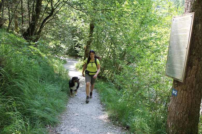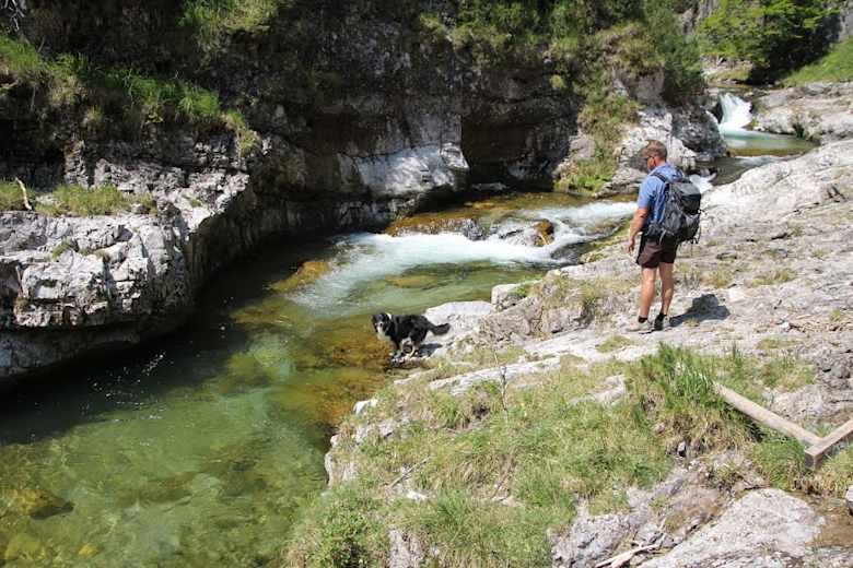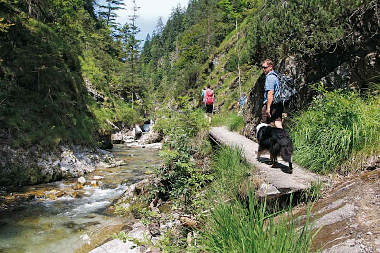 Diese für den Menschen eher als leicht einzustufende bayerische Rundtour hat so ziemlich alles, was ein bergbegeisterter Hund braucht – nur aufs Gipfelglück warten Herrchen und Frauchen vergeblich. Dafür lässt es sich einen Tag lang auf zumeist schattigen Wegen sehr gut aushalten. Langweilig wird es sicher nicht. Für unerfahrene Hunde kann es hier allerdings schon zur ersten Mutprobe kommen: Gitterrostbrücken und die steile, durchsichtige Gittertreppe zum Mauthäusl fordern viel vom Vierbeiner.