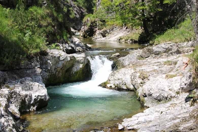 In der Weißbachschlucht im Berchtesgadener Land, die seit dem 15. Jahrhundert zur Trift, also dem Transport von Holz genutzt wurde, gibt es viel zu sehen und vor allem zu planschen.