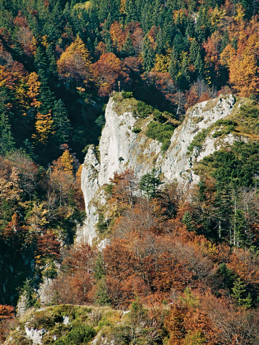 Der Abstiegsweg bringt uns aus dem Wiesensattel erst einmal gegen Westen zur Granderalm hinunter. Neben ihr müssen wir uns ein wenig rechts halten und in unbedeutendem Gegenanstieg zu einer Routenverzweigung hinauf. Bei ihr nach links weiter, über eine Wiese zum Waldrand und abermals links halten. Anschließend geht es über einen Waldrücken hinunter und wieder auf eine kleine, aber etwas luftige Steiganlage. Anfangs hantelt man sich am Drahtseil an einem Steilhang entlang, dann kommt man an den oberen Rand einer Eisenleiter. Couragiert steigt man auf ihr ab und findet sich wieder auf einem guten Wanderweg, der nach Westen zu einer imposanten Felswand führt.