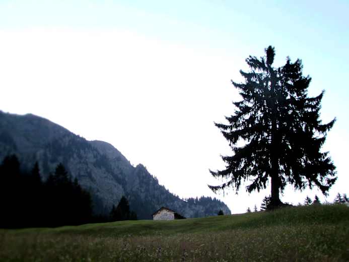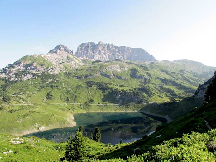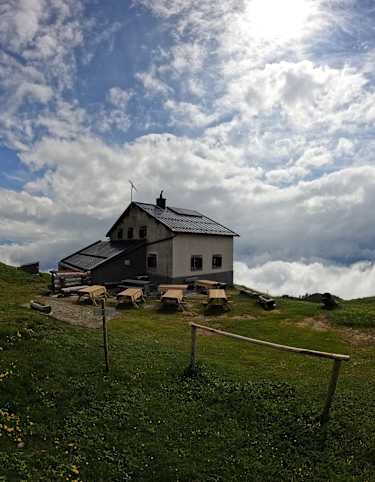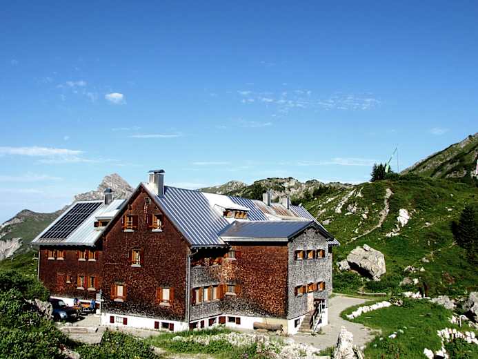 Der Weg schlängelt sich nun durch den engen Schmiedtobel, bis er eine erste Alp-Hochfläche (Mustrinalpe, 1.450 m) erreicht. Auf der gegenüberliegenden Seite schauen wir auf den felsigen Roggelskopf. Wir bleiben am Weg und steigen nochmals über eine Steilstufe zur Alpe Rauhe Staffel hinauf - viele Serpentinen durch Latschenvegetation. Einige Minuten später können wir die Freiburger Hütte bereits sehen. Die Hütte bietet sich für eine kleine Pause an. Zumindest kann man hier seine Wasserflasche auftanken. Wer nicht weiter auf die Saladinaspitze möchte, dem bieten sich mehrere Varianten an: der Abstieg nach Dalaas, der lange Weg nach Zürs über eine gut ausgebaute Straße bzw. mit dem Wanderbus oder der Weg nach Marul.
