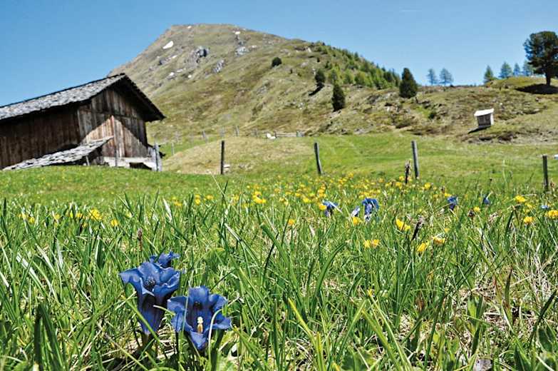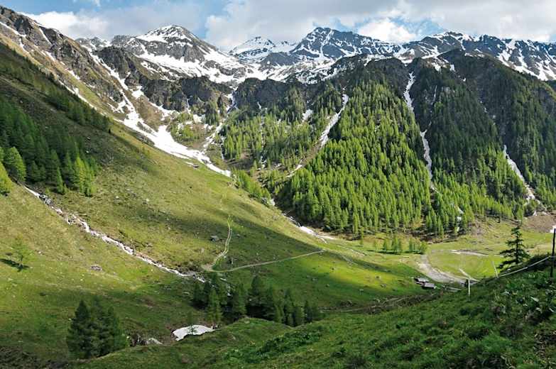 Nach einer gemütlichen Rast mit Buttermilch und Schafskäse folgen wir dem Pfad hinab ins Tal bis zur Auernigalm, 1857 m (auch Bartleralm genannt); wir queren das Tor Richtung Naturlehrpfad, der uns talauswärs durch das Astner Moos führt. Der als Rundweg angelegte Lehrweg bringt dem Besucher verschiedene Naturphänomene näher, z. B. faszinierende Lawinenstriche und kalkreiche Tuffbäche. Über eine Brücke, die den Astenbach quert, erreichen wir die asphaltierte Straße, die uns in wenigen Schritten wieder hinauf zum Sadnighaus führt.