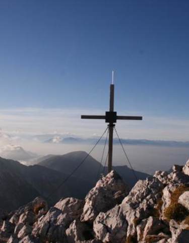 Wir übersteigen einen Zaun und kommen unterhalb des Kuhberges in freies Gelände mit äußerst blumenreichen Wiesen. Von einem flachen Sattel sehen wir hinüber zum Kleinobir und hinunter in das Rosental und nach Klagenfurt. Recht sanft gehen wir den Hang entlang und zur Ruine des ehemaligen Rainer-Schutzhauses, in deren Nähe wir auf den Anstiegsweg von der Eisenkappler Hütte, 2.090 m, treffen. Nun sind es nur mehr wenige Minuten zum großen Gipfelkreuz auf dem Hochobir, 2.139 m. Eine Tafel weist darauf hin, dass sich hier bis zum Jahre 1947 eine meteorologische Messstation befand. Die Aussicht vom breiten Gipfel ist wahrlich grenzenlos!
