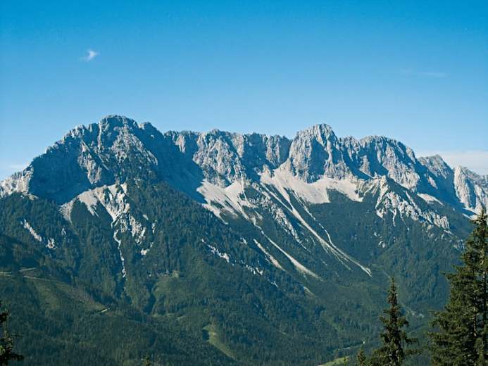 Am Schaidasattel beginnt der Simon-Rieger-Steig, Weg Nr. 623, der ein kurzes Stück auf einer Forststraße verläuft. Auf dem sehr gut markierten und beschilderten Weg, der bald in den Wald abzweigt, kommen wir rasch höher. Wir queren mehrere Male die Forststraße, auf der wir – schon hoch oben – für einige Minuten verbleiben, um sie dann auf einer hölzernen Treppe nach links zu verlassen. Wir erreichen den in den Karten nicht bezeichneten Kuhsattel, ca. 1.700 m, mit einer kleinen Wiese und dem Kacmun-Kreuz; eine Warntafel macht uns darauf aufmerksam, dass wir die alten Bergbauanlagen in diesem Gebiet nicht betreten dürfen.