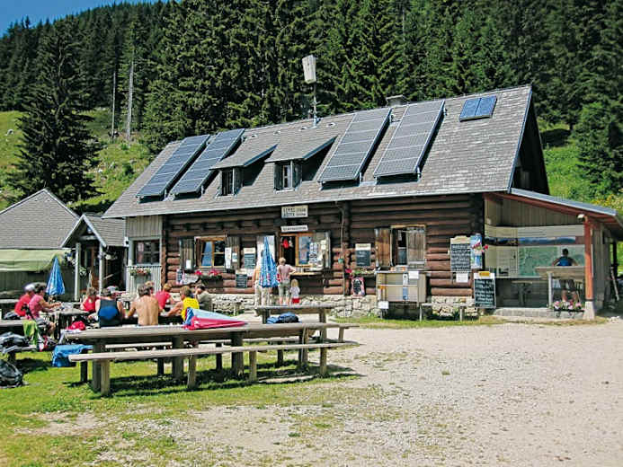 Im Abstieg gehen wir wieder hinunter zur erwähnten Ruine des Rainer-Schutzhauses; eine Info-Tafel erklärt die Geschichte dieses Hauses, das im Jahre 1944 durch Brandstiftung zerstört wurde. Der breite Weg bringt uns an der »kalten Quelle« und an einigen Tafeln des naturkundlichen Rundwanderweges vorbei zum Wald, wo der Steig wegen der vielen Wurzeln und Steine recht mühsam zu begehen ist. Wir erreichen unser nächstes Ziel, die sehr schön gelegene Eisenkappler Hütte, 1.553 m. Die große, sonnige Terrasse und die schmackhaften Speisen laden zur wohlverdienten Rast ein. Danach folgen wir dem Weitwanderweg 603 Richtung Zell-Pfarre und Schaidasattel.