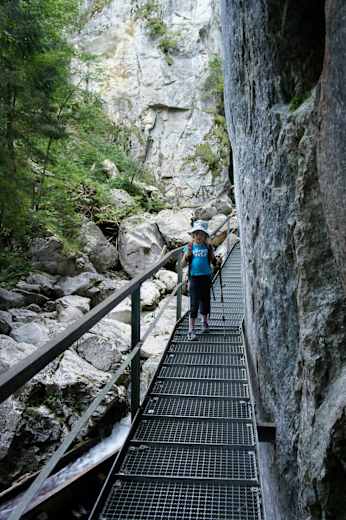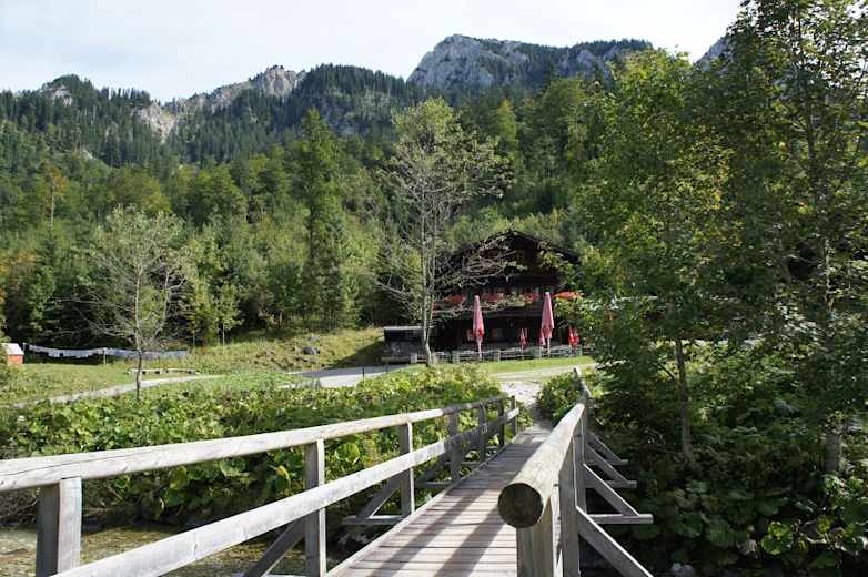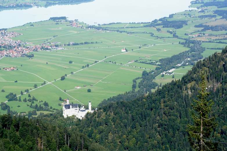 Vom Säulingshaus an der Südwand bis zur Wildsulzhütte zurückwandern. Ins Tal zum Schloss Neuschwanstein absteigen. Wer viel Zeit hat, stellt sich am Ticketschalter an um noch einmal auf die Führung zu warten. Alle anderen wandern über die malerische Pöllatschlucht zurück. An deren Ende angekommen rechts halten und den Schildern zur Tegelbergbahn folgen.