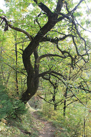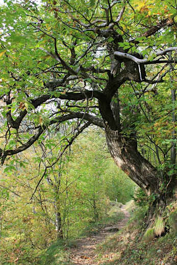 Vom Schloss (Besichtigung absolut empfehlenswert) steigt man den gepflasterten Weg hinab zum Parkplatz und zur Bushaltestelle.