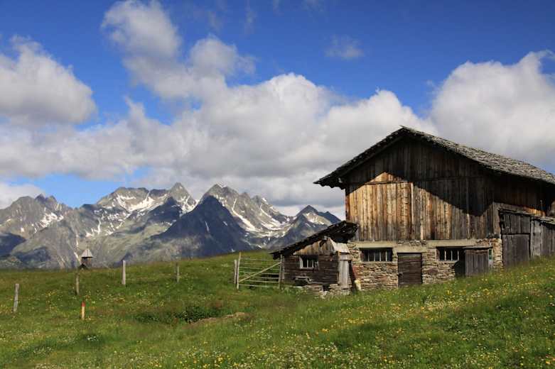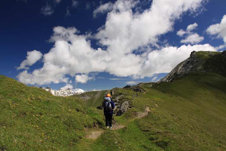 Eine Almstraße führt vom Sadnighaus in Kehren bis auf 2.000 m Höhe und quert dann in der Südflanke des Sadnig zum Gasthof Glocknerblick, 2.047 m. Die Kehren können wir auf einem Wanderweg abkürzen, dann gehen wir mit kleinen Gegenabstiegen gemütlich auf der Straße an der Jausenstation Almhüttl, 2.025 m, vorbei zum Gasthaus mit dem klingenden Namen. Ganz verschämt zeigt uns der Großglockner nur seine Spitze, viel interessanter ist hier die Aussicht in die Schobergruppe.