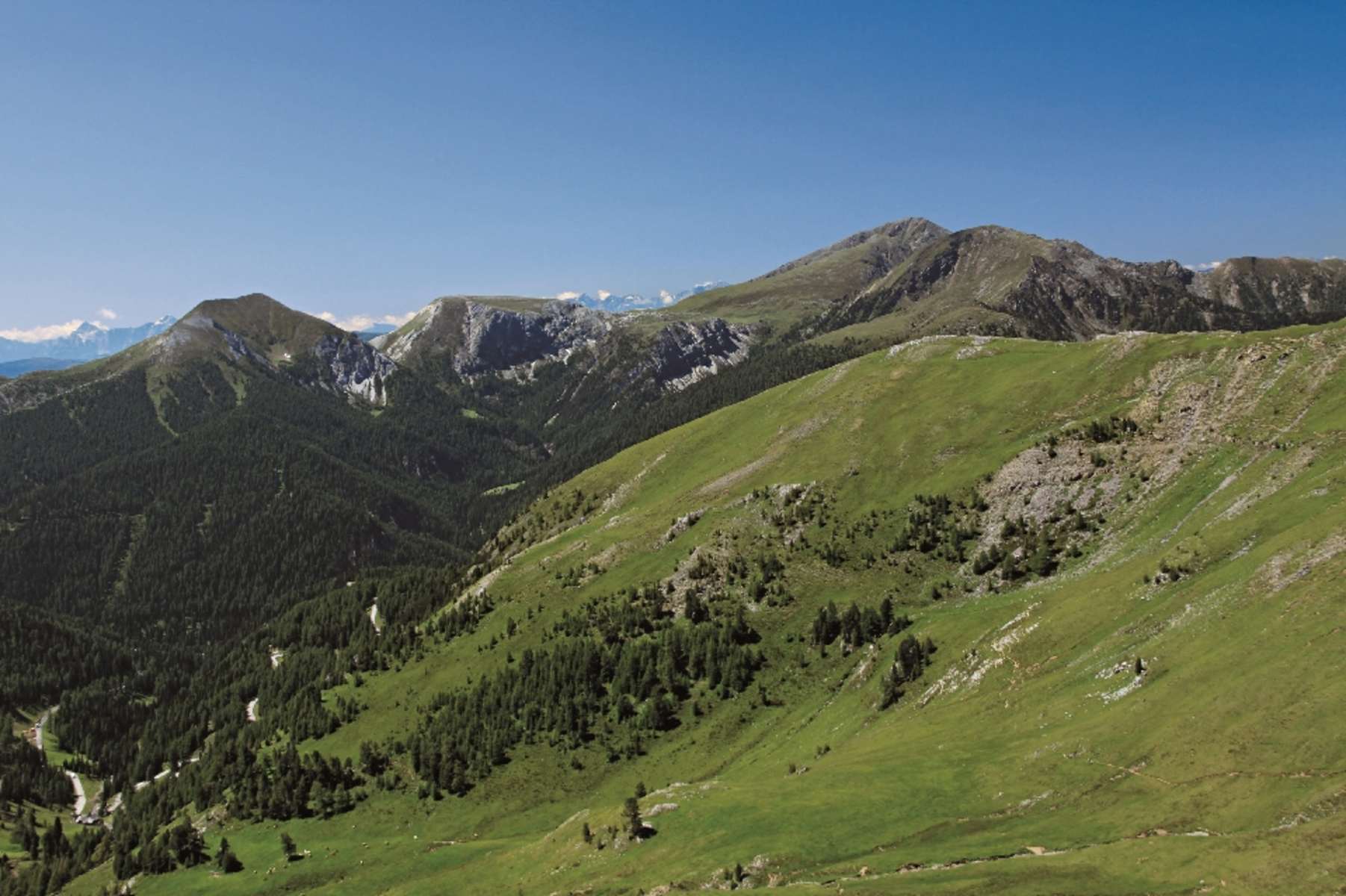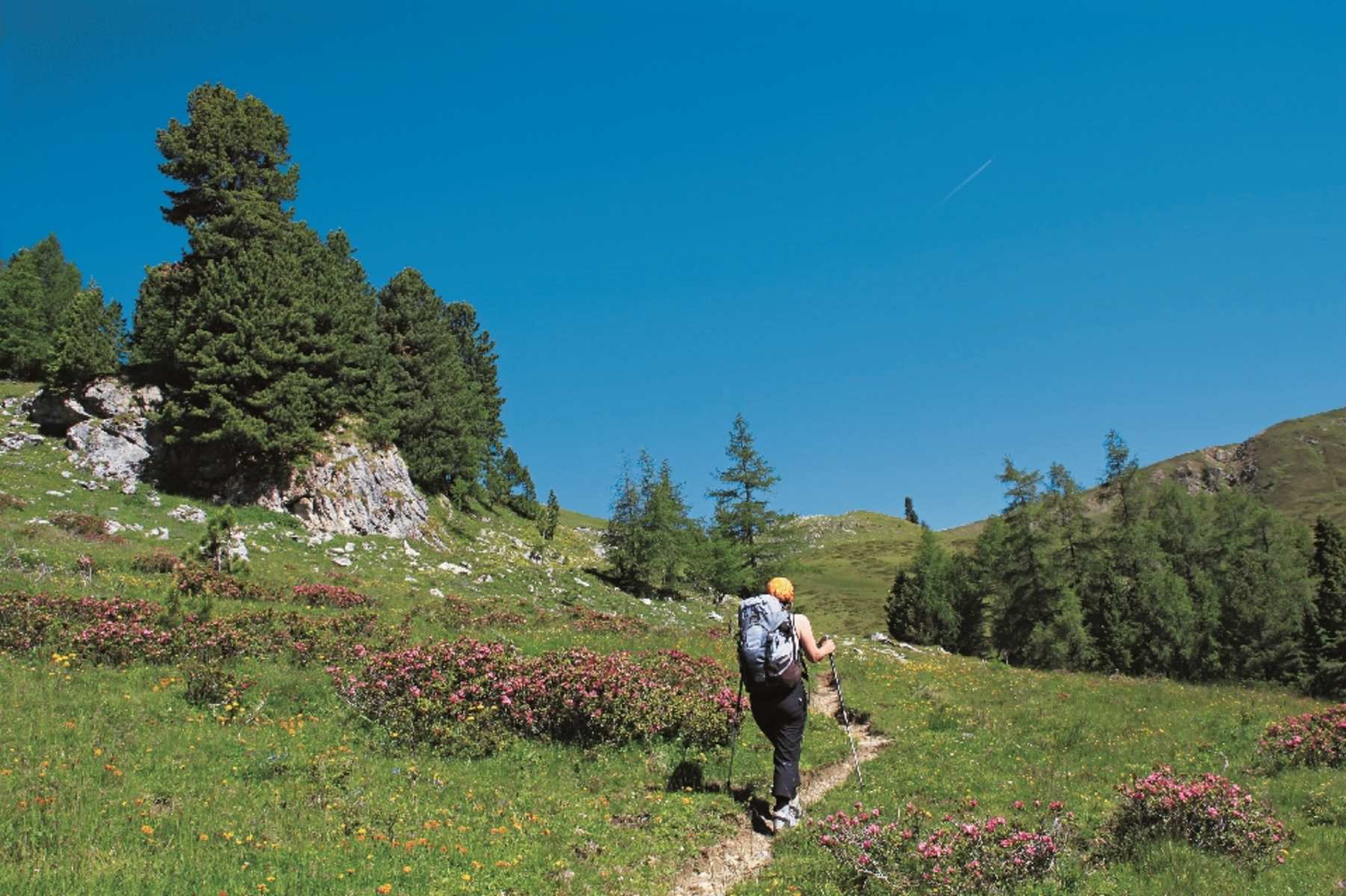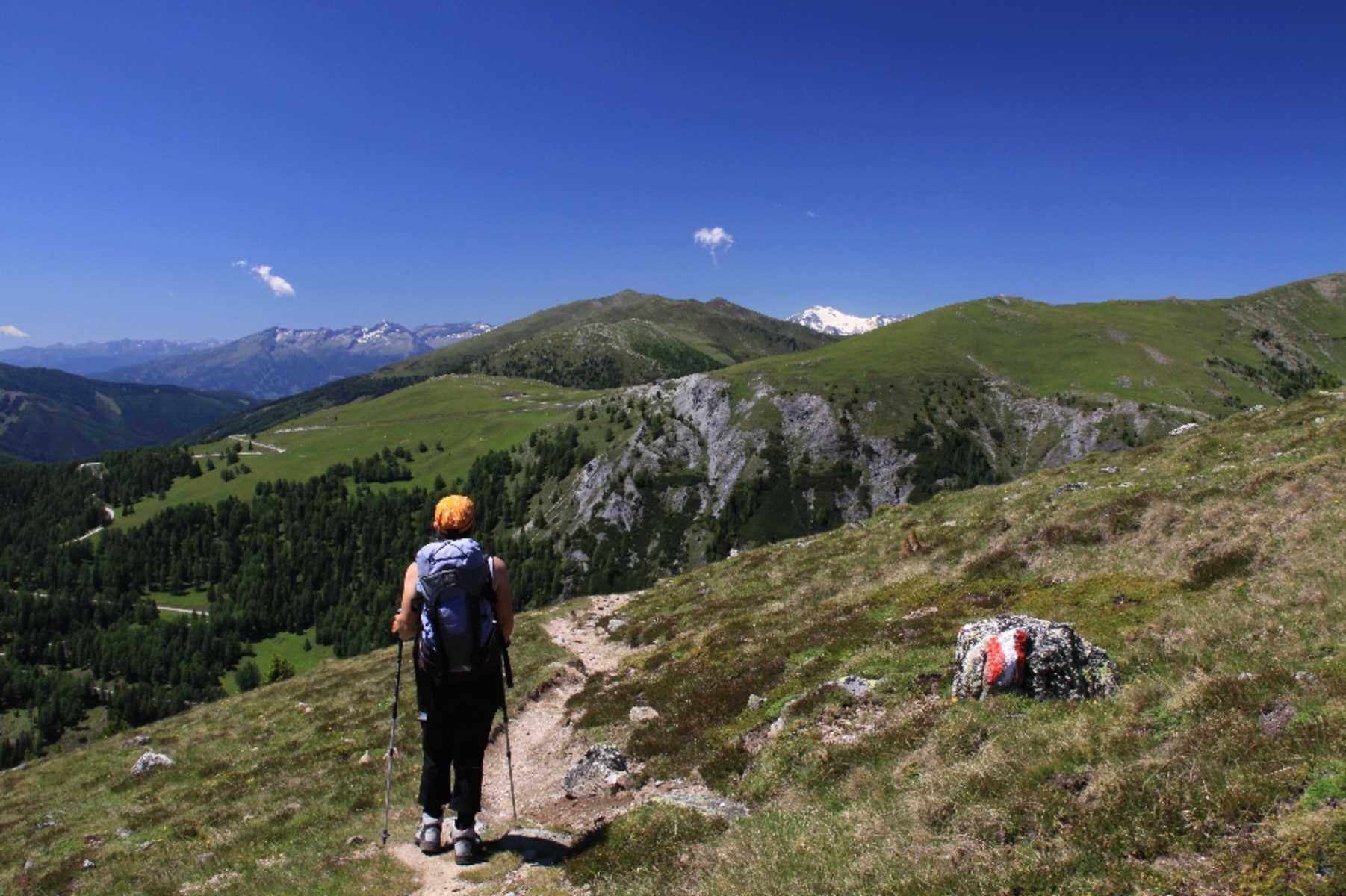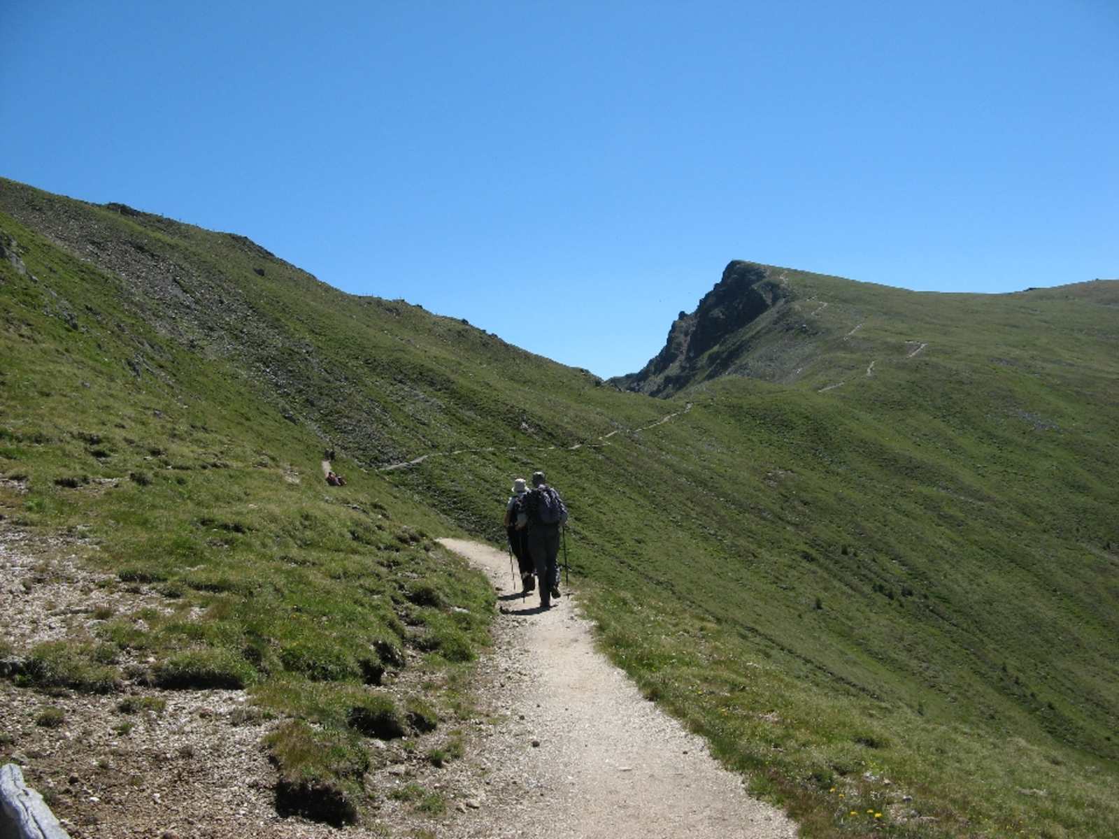 Weiter führt uns der breite Weg an der Friesenhalshöhe entlang in die Königstuhlscharte und von dort in steilen Serpentinen auf den Gipfel des Königstuhls. Weit ist die Aussicht über die sanft gerundeten Nocken bis zu den Gletscherbergen der Hohen Tauern. Im Abstieg wandern wir über den breiten Gipfelrücken nach Süden bis zum Karlnock, wenden uns dort nach links und steigen über den Grat steil bergab in eine Scharte. Von dort wandern wir nach Süden hinunter in den lieblichen Stangboden, 1.950 m, und weiter in westlicher Richtung durch ein lichtes Lärchenwäldchen und blühende Alpenrosen hinunter zum Karlbad.