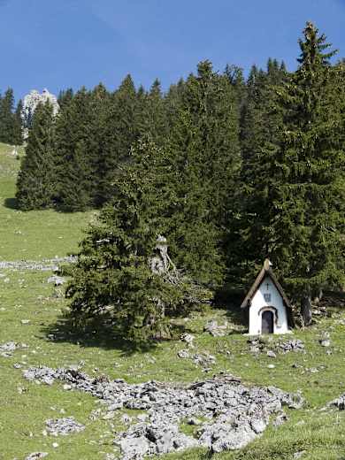 Wer es schafft, sich zu überwinden, der geht am breiten Weg weiter, an einer kleinen Kapelle vorbei und – bei der Weggabelung links – bis zur Neuhüttenalm. Der weitere Anstieg führt von der Alm in den weiten Sattel zwischen Neuhütteneck und Fockenstein, in der Einsattelung rechts und steil gegen Norden über Wiesen und ganz zum Schluss etwas durch die Felsen zum Gipfel des Fockensteins hinauf.