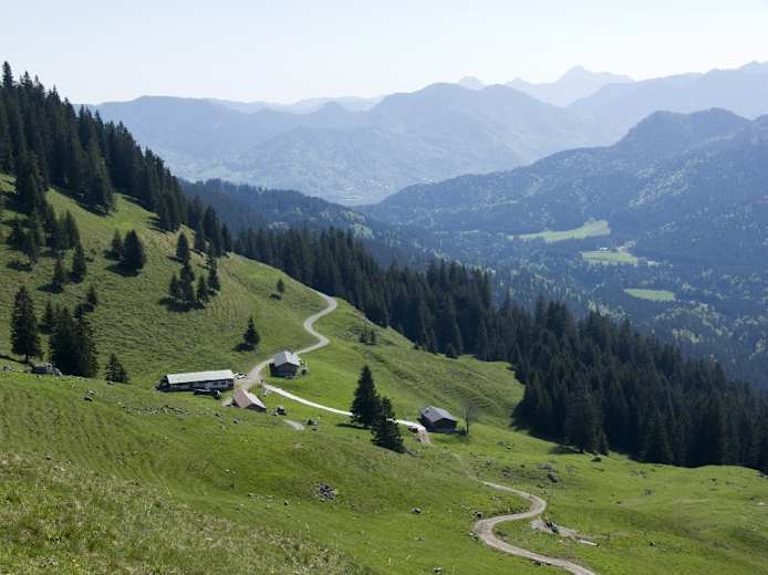 Der Abstieg verläuft auf einer anderen Route. Das erste Stück fällt er gegen Osten auf einem markierten Pfad über den bewaldeten Gratverlauf steil ab. Dann treffen wir auf den Aufstiegsweg, dem wir bis zur Hüttenterrasse der Aueralm folgen.
