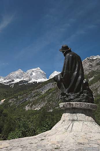 Das Denkmal zeigt Kugy, wie er zu seinem geliebten Jalovec blickt. Foto: Evamaria Wecker, Rother Bergverlag