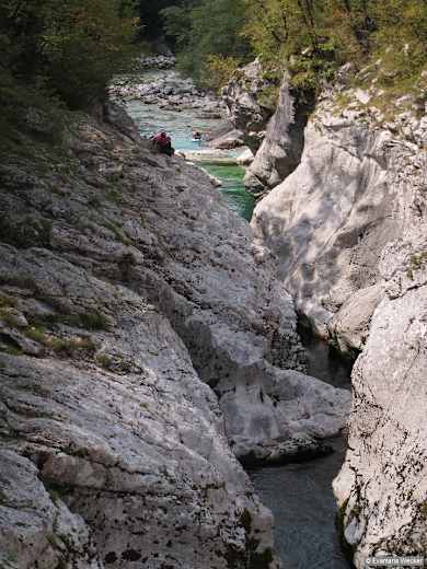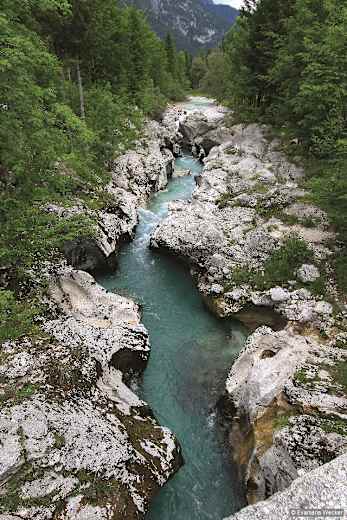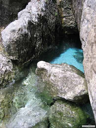 Nur wenige Meter breit ist die Mala Korita (Kleine Schlucht), 500 m, in der sich der Fluss zwischen bizarren Felsen und malerischen Kolken hindurchzwängt. Nach der Schlucht verbreitert sich die Soča und strömt so ruhig dahin, als wollte sie Kräfte sammeln für das nächste Abenteuer, die Velika Korita. Wir setzen unseren Weg am linken Sočaufer fort, passieren die Brücke nach Soča (Gostišče Andrejc, sehr gute Forellen!) und eine weitere kurz vor der Velika Korita; beide Brücken bieten schöne Tiefblicke auf den Fluss.