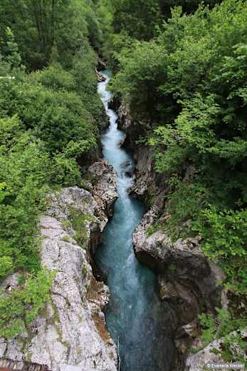 Wir erreichen den Beginn der Velika Korita (Große Schlucht), dort führt ein Pfad nach rechts zu einem schönen Aussichtspunkt über der Schlucht. Auf einer Länge von 750 Metern hat sich die Soča bis zu 15 Meter tief durch die senkrechten, teils überhängenden Felswände gegraben und sich ein enges Bett geschaffen. Wir wandern hoch über der Schlucht bis zu ihrem Ende am Eingang ins Lepenatal. Durch die letzten malerischen Kolke, unter der Brücke ins Lepenatal (7; Parkmöglichkeiten), 450 m, hindurch zwängt der Fluss sein Wasser in ein breites Bett mit schönen Kiesbänken.