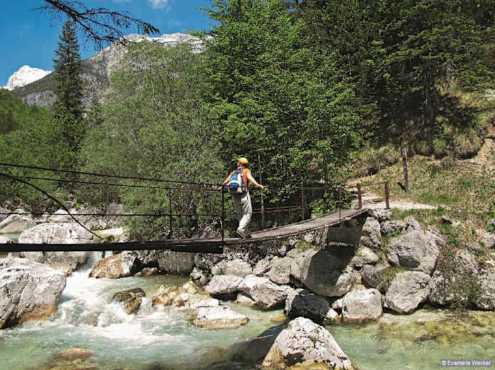 Auf einer der vielen Hängebrücken über die Soča. Foto: Evamaria Wecker, Rother Bergverlag