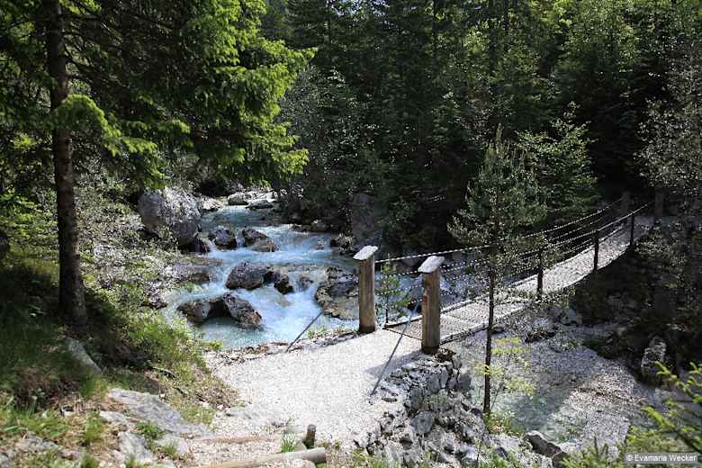Sobald wir wieder am Fluss sind, lockt die nächste Hängebrücke mit einem Abstecher nach Trenta/Na Logu, 640 m. Foto: Evamaria Wecker, Rother Bergverlag
