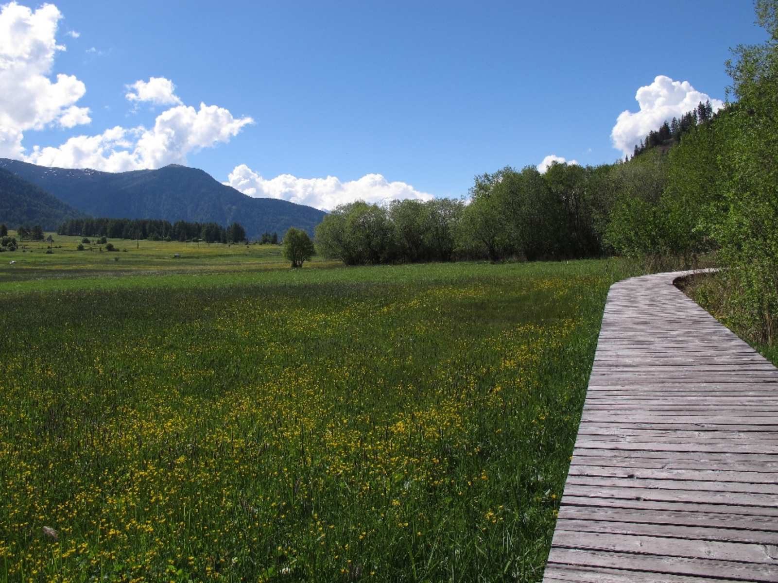 Vom Parkplatz gehen wir zurück zur Etschbrücke. Da wir den Ortler vom Westufer nicht sehen können wollen wir am Ostufer entlang nach Süden wandern und biegen östlich der Etschbrücke in den Seerundweg ein. Wir bummeln auf dem breiten, bequemen Weg nach Süden, bestaunen Ortler und Königspitze und erreichen schließlich Fischerhäuser, 1.453 m, (Parkplatz, Bushaltestelle).