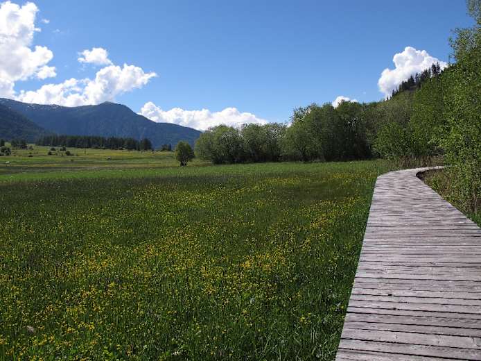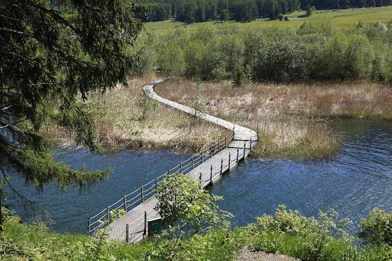 Diese einfache Wanderung folgt dem breiten Uferweg mit vielen Rastbänken rund um den See, am südlichen Ufer geht es auf Holzstegen durch den Schilfgürtel und über eine schwimmende Brücke.