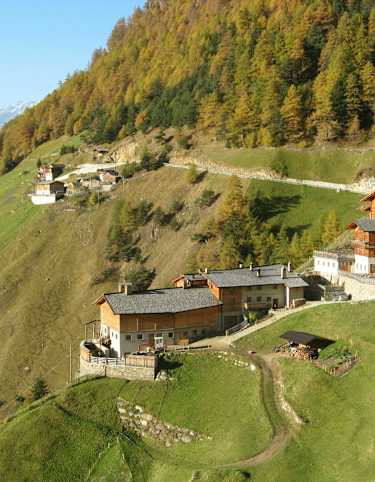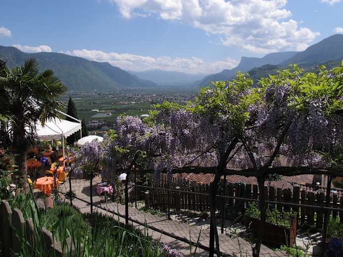 Nachbar des Gasthofs ist der Buschenschank vom Larchwalder Hof, eine urig-einfache Jausenstation, von der man gut auf die Pferderennbahn von Meran hinunter sehen können.