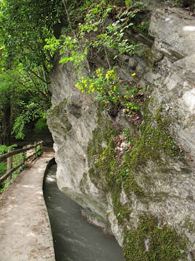 Nun wandern man auf Wegen und Stegen an den Felsen und bald auch am Wasser entlang im Wald nach Osten, kreuzen eine Straße (Abstieg zehn Minuten zum Braugarten Forst) und setzt den Weg durch eine Apfelplantage fort.