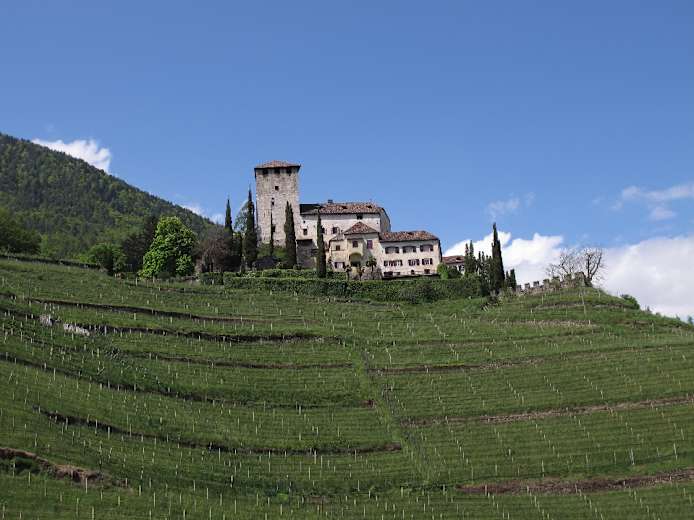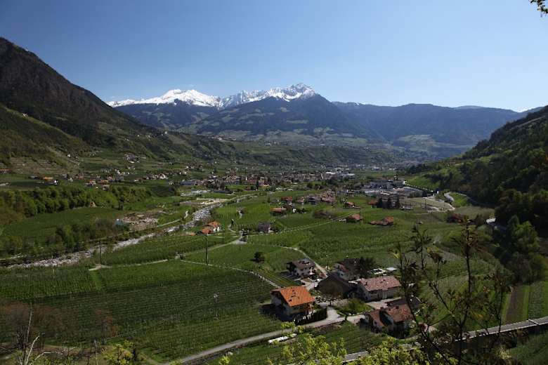 Erst kurz vor Tscherms, unterhalb von Schloss Lebenberg, lösen Weinberge die Apfelbäume ab und der Weg wird zunehmend freier und damit auch sonniger. Eine lohnende Tour an den Ausläufern der Ortler Alpen in Südtirol