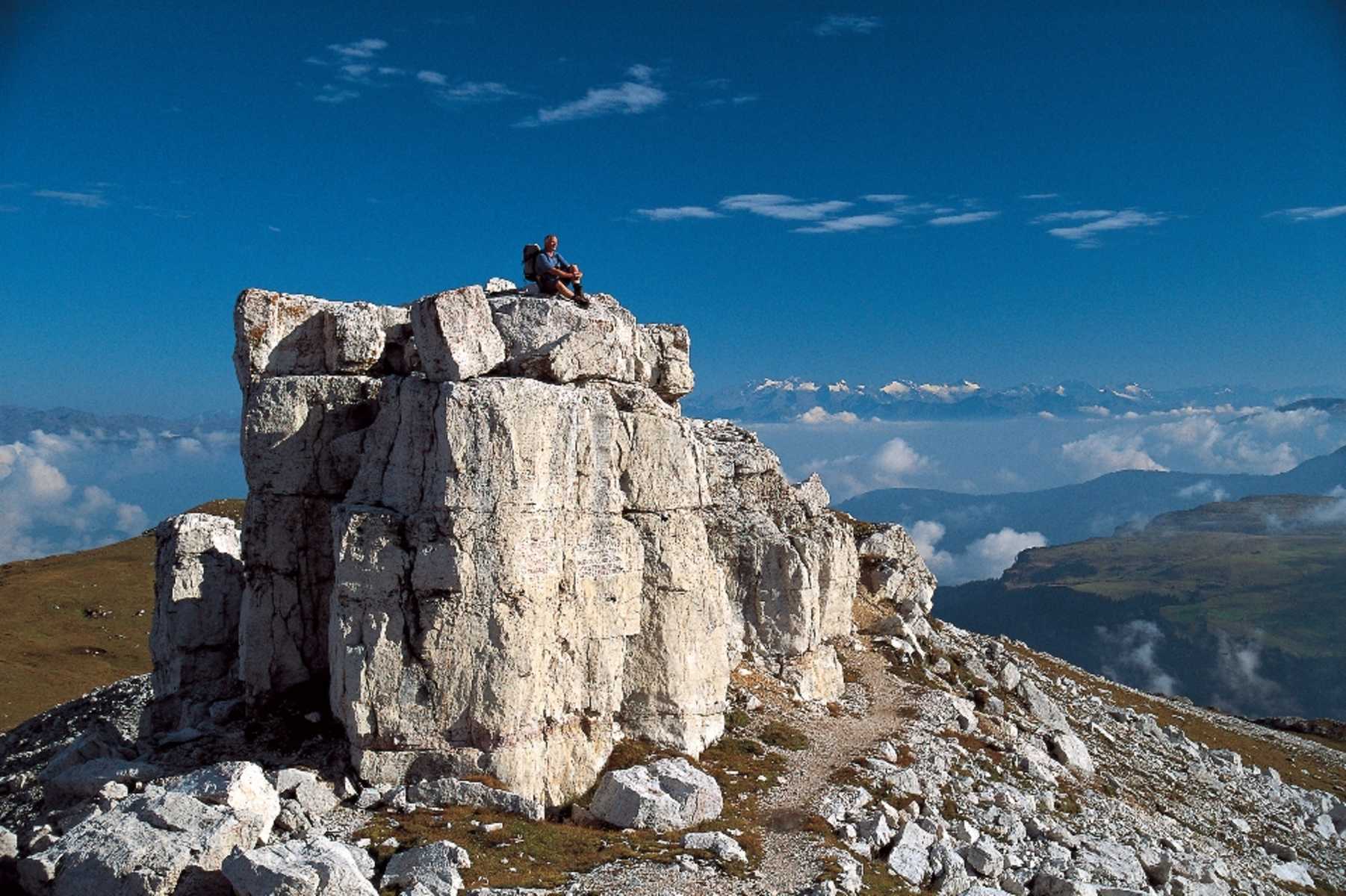 Jetzt steht man am höchsten Punkt des ganzen Schlernmassivs, dem Petz (2.564 m). Er besteht ebenso wie die nördlich anschließenden Felsklötze aus dem jüngsten Schlerngestein, dem hier fast blendend weißen Hauptdolomit.