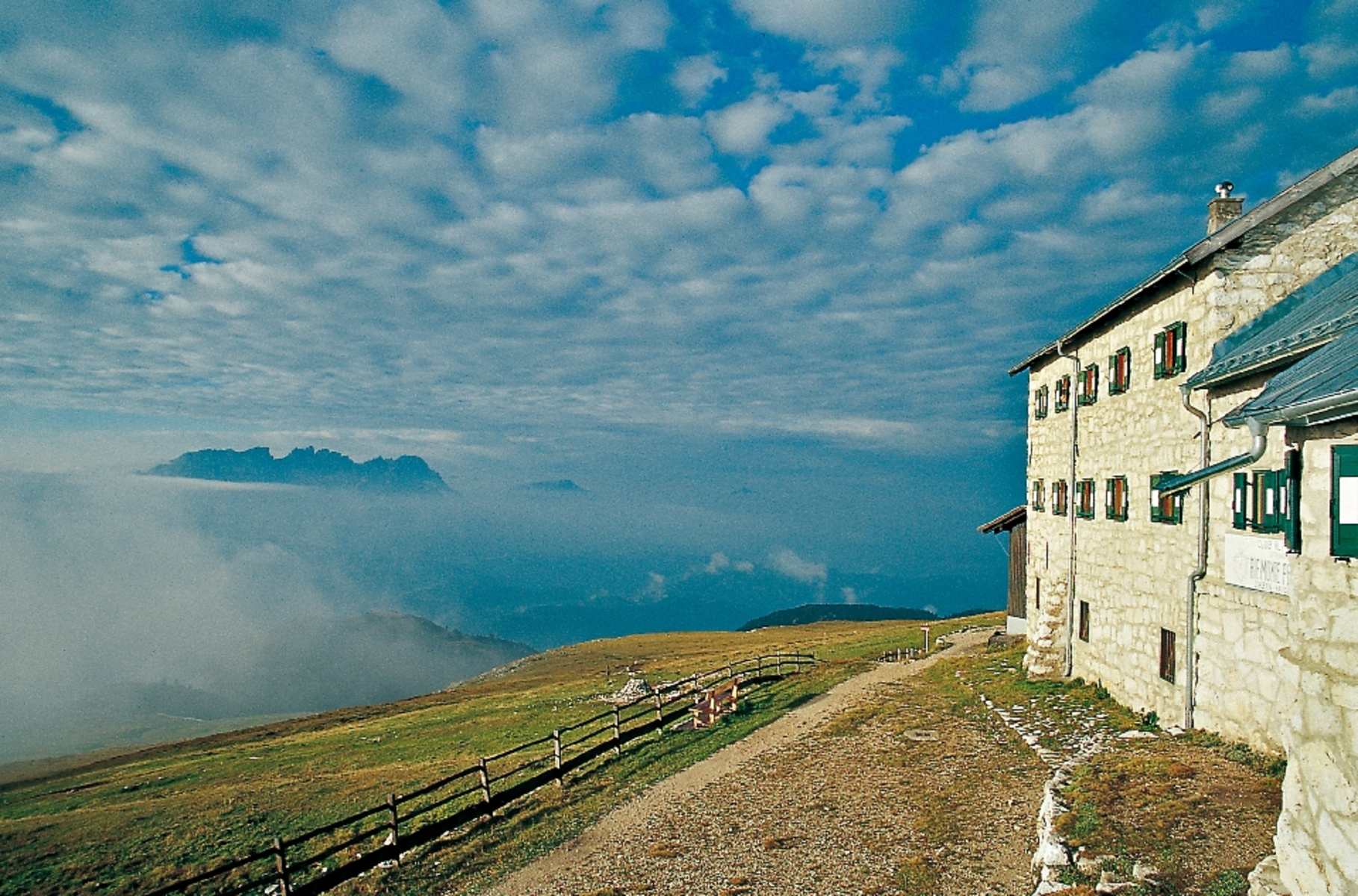 Auf ca. 2.230 m kreuzt man einen querenden Viehsteig und folgt den Markierungssteinen auf ein geneigtes Plateau. Unter der Materialseilbahn hindurch bleibt man immer links von einer „Bucht“ des Plateaurands. Schließlich nähert sich der Pfad wieder der Seilbahntrasse und nach einem längeren Abschnitt mit geringer Steigung sind die Schlernhäuser (2.457 m) erreicht.