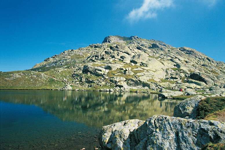 Links hinter dem See ragt die Große Laugenspitze steil in den Himmel. Man geht vom See nach links hinüber zum markanten Südostrücken der Laugenspitze. Oberhalb der Einmündung des Weges von der Laugenalm wird der Rücken felsig.