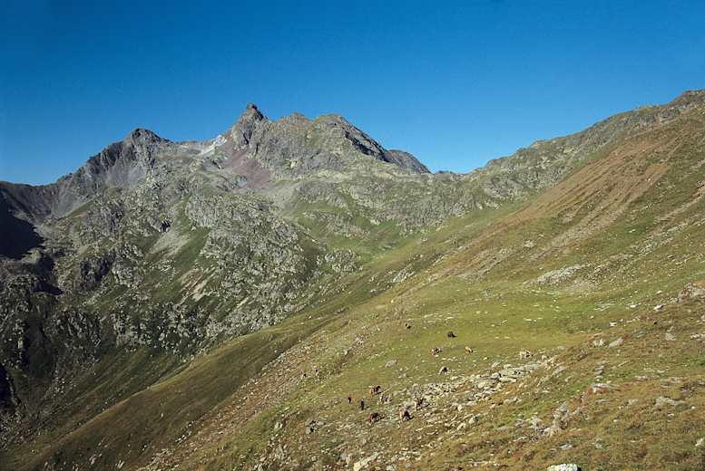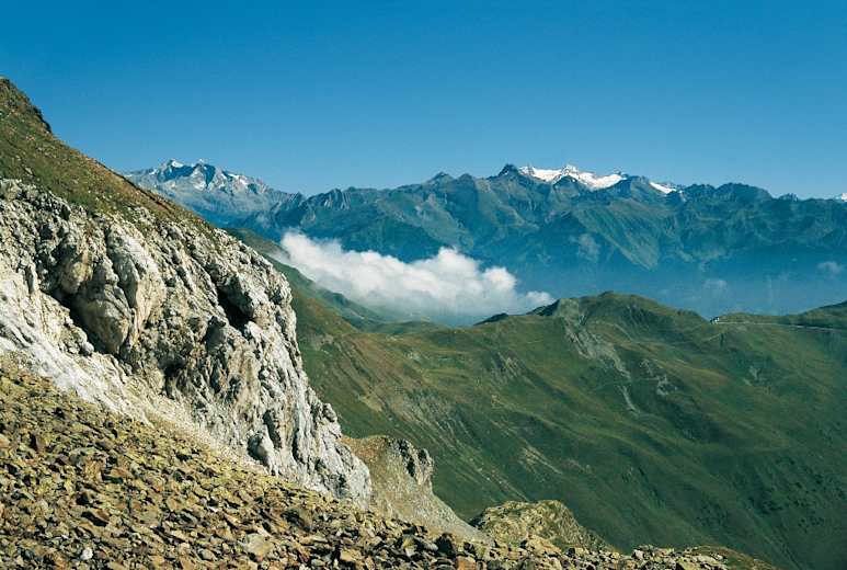 Über einen Rücken, durch Mulden (im Frühsommer Altschneereste) und an einem auffallenden Felsblock vorbei gelangt man ins Gröllerjoch (2.557 m). Das „Weiß“ im Bergnamen bezieht sich im Übrigen auf die ungewöhnlichen Einschübe aus dolomitisiertem Riffkalk, die hier inmitten des vorherrschenden glimmerreichen Schiefergneis besonders auffallen.