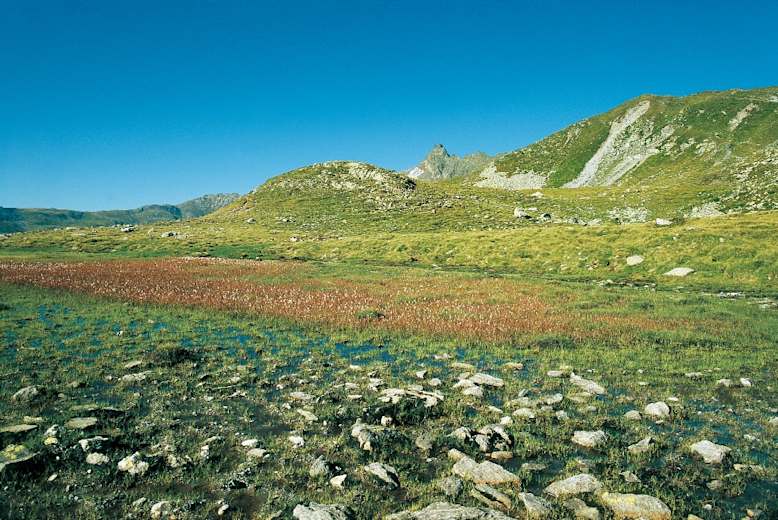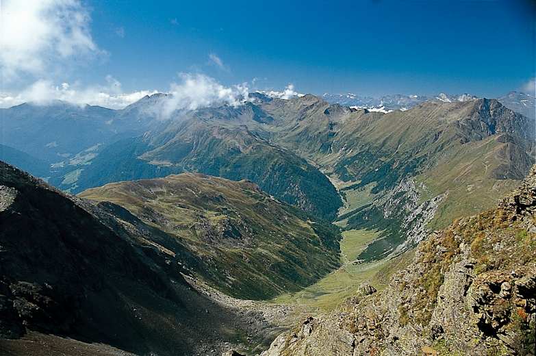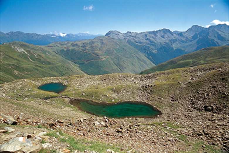 Entweder durch Blockwerk zu den beiden Steinwandseen (2.320 m) oder ohne Höheneinbuße den Gewässern rechts oberhalb ausweichen (etwas ausgesetzt). Übrigens fließen die Seen in der Trümmermulde unterirdisch ab, treten etwas tiefer aus und bilden die Quelle der Talfer.